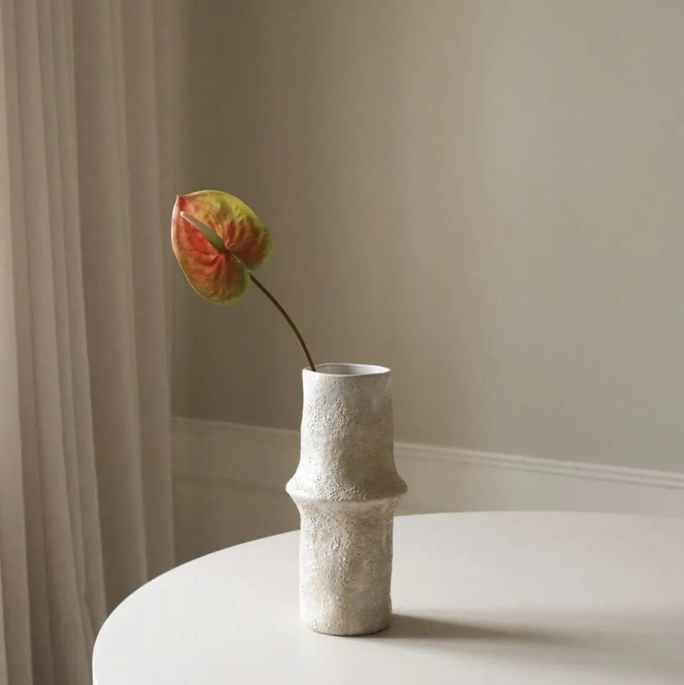 Denne Pink Medium Anthurium Flower har en Single bred, hjerteformet blomst med en blanding af bløde lyserøde og grønne nuancer. Overfladen af den petal-lignende spathe er lidt kruset, fremvisning naturlige farvevariationer. En tekstureret, lysegrøn spadix strækker sig fra midten og supplerer blomsternes gradienttoner. Blomsten understøttes af et buet, glat grønt skaft, der måler 54 cm i højden. Den store keramiske jordvase på billedet måler 30,5 cm i højden og 10 cm i diameter.