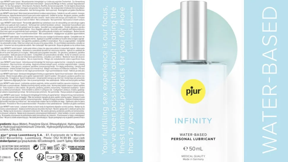 pjur INFINITY The best pjur premium quality in attractive packaging. The elegant glass bottle is very sturdy and the high-quality box has an eye-catching design, look and feel. Perfect for anyone who refuses to compromise on their personal lubricant. An ideal gift for those very special occasions. Water-based personal lubricant to relieve vaginal dryness. Suitable for use with condoms. Increases comfort during sex. It is pH-optimised and moisturises without feeling sticky.