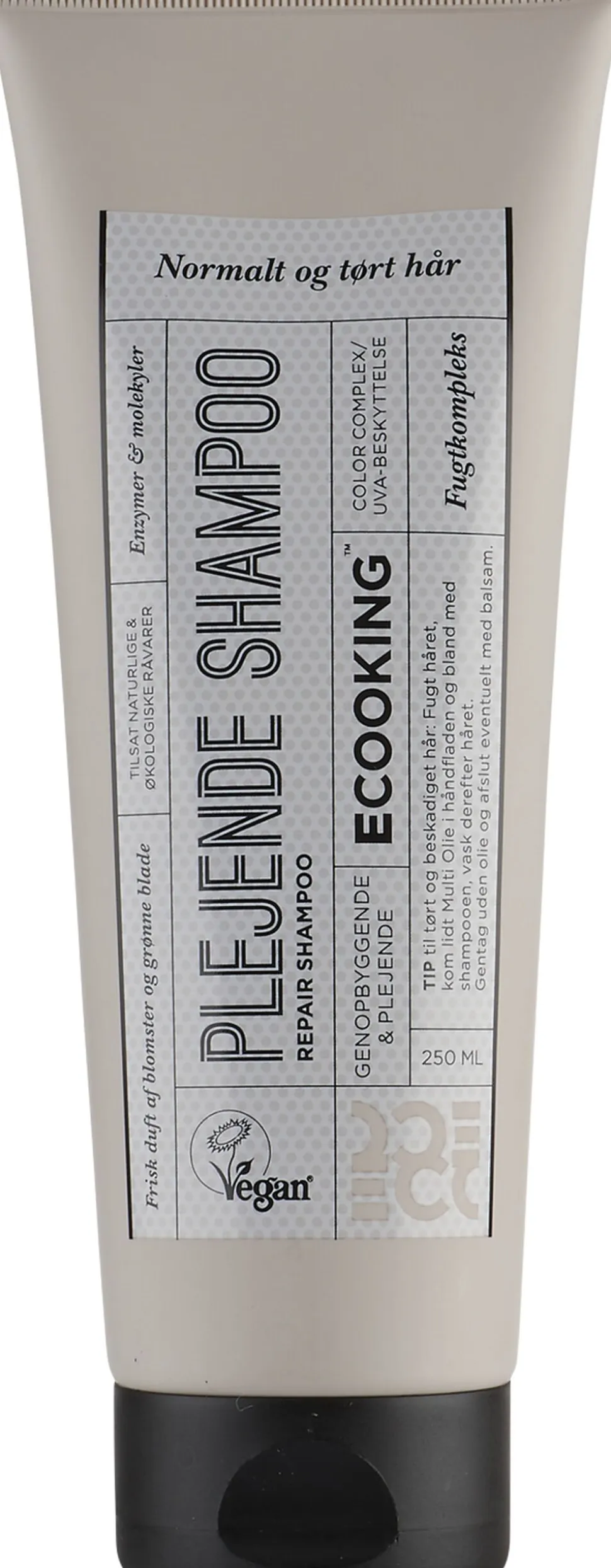 Ecookings Plejende Shampoo genopbygger og plejer tørt hår. Shampooen indeholder et fugtkompleks, der både virker fugtighedsgivende og fugtighedsbevarende for hårstrået i op til 72 timer. Shampooen efterlader håret dejligt blødt og indeholder et farvekompleks, samt UVA-og forureningsbeskyttelse, som blandt andet beskytter dit hår og din hårfarve (både farvet hår og naturligt) imod sol, vand, luft og forurening. Derudover er den rig på peptider, der forbedrer hårstrukturen, hvilket fører til et hår der fremstår tykkere, fyldigere og sundere. Plejende Shampoo har en frisk duft af blomster og grønne blade. 100% vegansk, dermatologisk testet og uden SLS og SLES. Anvendelse: Fordel shampooen i vådt hår og masser blidt ind. Skyl grundigt med vand. Gentag efter behov. TIP: Afslut med Ecooking Plejende Balsam for optimal pleje og blødhed.