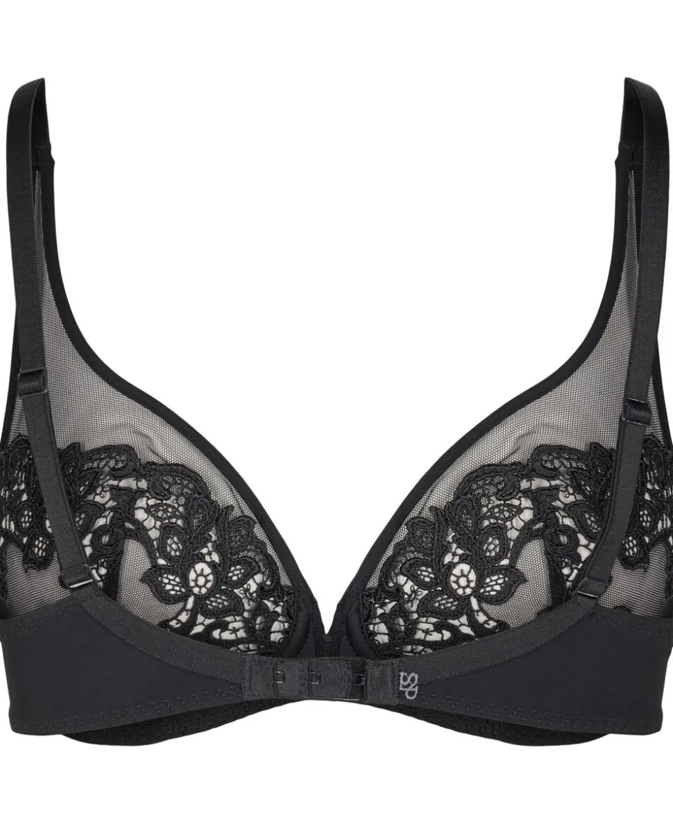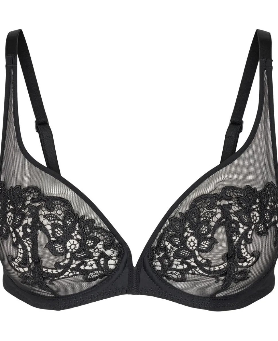 En elegant kollektion, hvor broderi og guipure blonder blander sig med tylens lethed. Glamourøs og raffineret. Push-up bh med Bøjle og guipure blondebroderi. Dyb halsudskæring. Push-up effekt. Vatteret skåle med aftagelig puder med perlepolstring der centreret og giver fyldig barm. Med bøjle og puder.