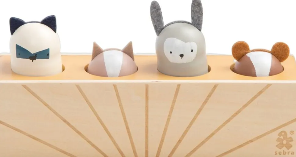 Lad barnet øve sig på at trykke på dyrehovederne, og se begejstringen, når ét dyr trykkes ned, og ét andet hopper op. Legen udvikler dit barns hånd-øje-koordination og er en sjov leg, der aldrig bliver kedelig. Pop-up-legetøjet er designet i Danmark og fremstillet af certificeret træ, der kan holde til flere søskende.
