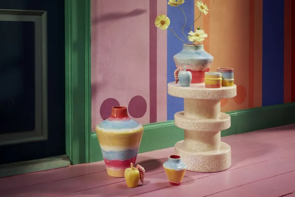 Farverig popkultur møder håndlavede designtraditioner i samarbejdet mellem Kähler og designduoen KIMPOP, der tæller tv-personlighederne Sofie Linde og Joakim Ingversen. I en årrække har duoen med stor passion udforsket keramikkens verden, og deres viden om glasurer, brænding og det keramiske håndværk forener de med deres kærlighed til pop og populærkultur med udgangspunkt i de sene 80ere og tidligere 90ere, som de selv er rundet af. Og resultatet? Kollektionen Pottery, der er lige så farverigt som Sofie og Joakim. KIMPOP ønsker at udfordre danskernes brug af farver i boligen, bryde med de traditionelle skandinaviske farvetraditioner og invitere os til at tage flere farverige chancer i indretningen. Den nye kollektion fra Kähler X KIMPOP er et selvsikkert mix af pasteller, opulente glasurer, humoristiske detaljer og former, der vil frem i verden. Den største af vaserne på 32 cm i højden har en unik æbleformet prop i mint med en finurlig detalje: en lille lyserød orm. For hvorfor skal vasen egentlig bare stå og gabe, når der ikke er blomster i? Med sit iøjefaldende design fungerer vasen som et statement piece og vil øjeblikkeligt tilføje et farverigt og legende element til indretning og et boost af livsglæde.