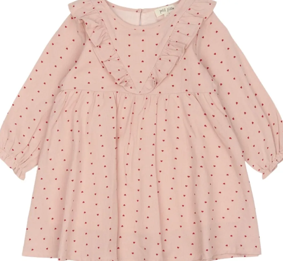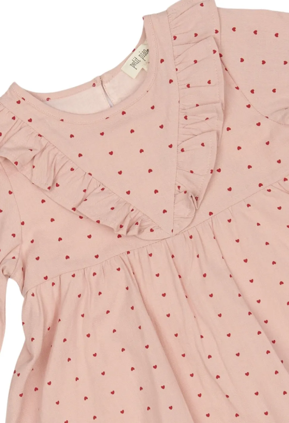 Langærmet kjole fra Petit Piao. Det bløde muslinstof er printet med søde små hjerter. Den lille flæse ved halsen giver den afslappede kjole et sødt twist. Kjolen lukkes bagpå med en lille knap. Pasformen er løs og behagelig. Produceret i Kina.