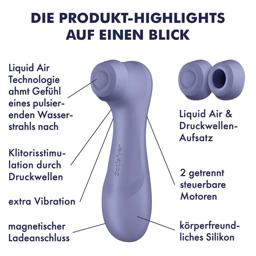 Satisfyer Pro 2 Generation 3 er efterfølgeren til den ikoniske Pro 2 – nu med innovativ Liquid Air-teknologi. Oplev pulserende luftbølger, der føles som strømmende vand, kombineret med 12 vibrationsprogrammer og 11 trykbølgeniveauer. Et elegant design i silkeblød silikone giver dig maksimal klitorisstimulation uden berøring.