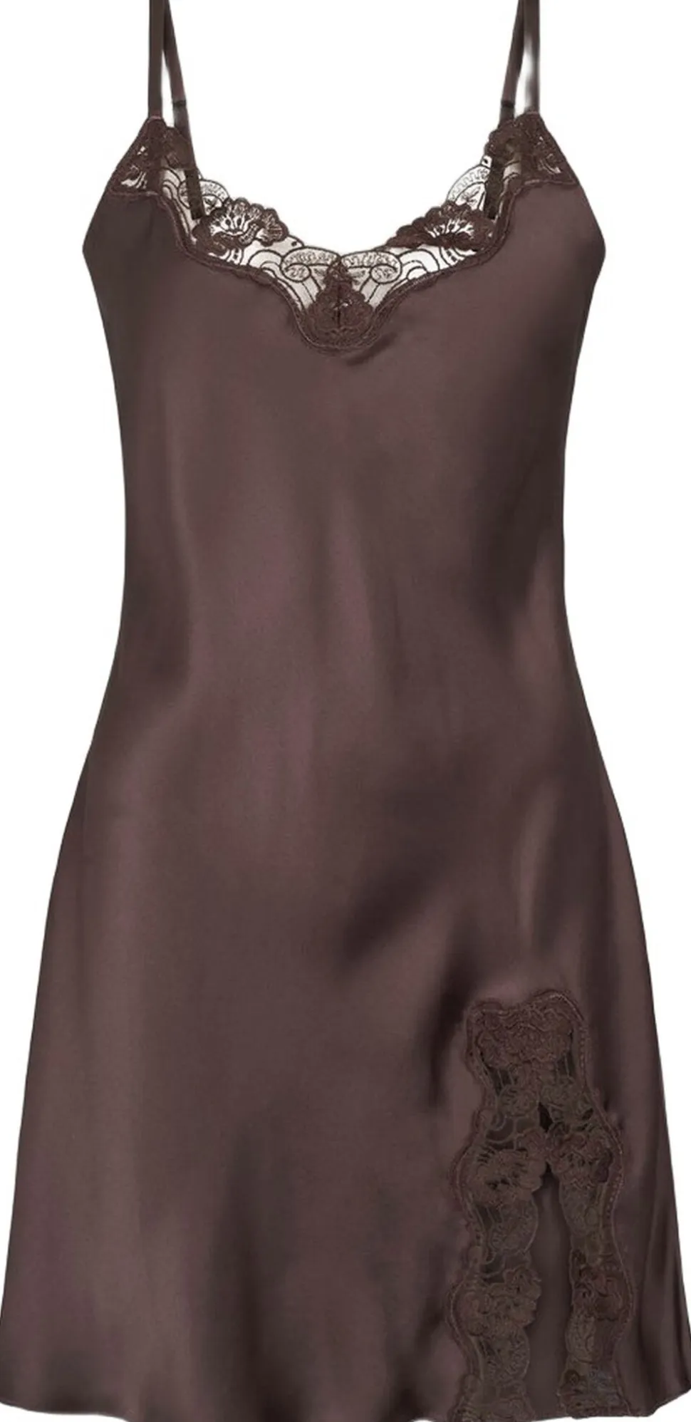 Lace slip i 100 % vævet silke. En virkelig feminin natkjole med smukke blonder i venstre side nederst, som også gør den perfekt at have på som kjole. Justerbare stropper og nem at montere. Håndvask