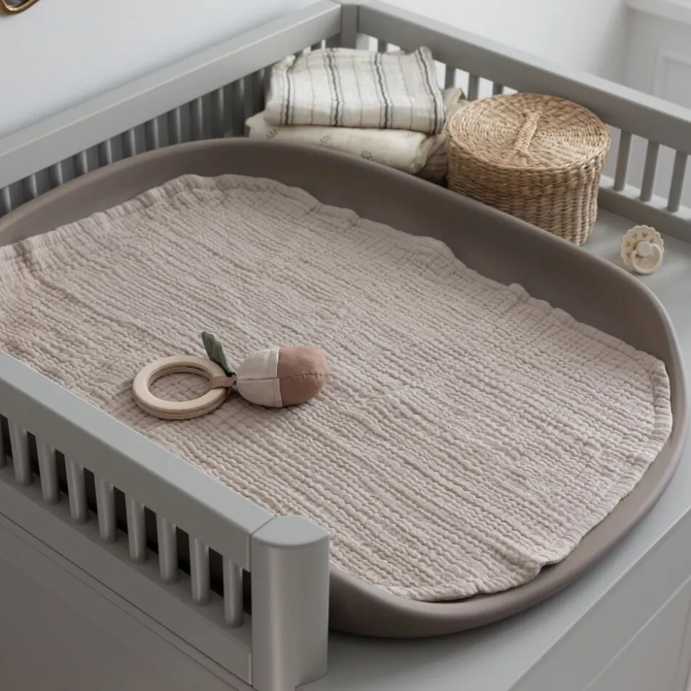 Pusleunderlaget består af seks lag musselin i farven Jetty beige og er blødt og behageligt for den lille at ligge på, når det er tid til bleskift. Det fungerer som et håndklæde, du lægger oven på puslepuden for at gøre det ekstra blødt og lunt.