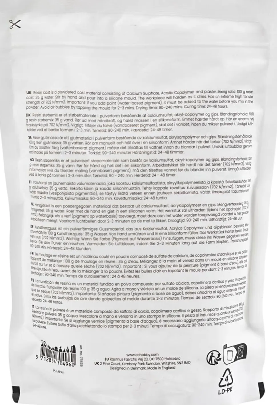 Støbemateriale i pulverform, som du kan bruge til at skabe smukke genstande til hjemmet. Blandes med vand og hærder ved stuetemperatur. Tilsæt fx farve, glimmer eller terrazzoflager, og skab flotte effekter. Resin støbemix er det perfekte valg til dit kreative støbningsprojekt. Du blander blot pulveret med vand, rører massen ud med håndkraft og hælder massen i en silikoneform. Hvis du vil tilføje farve, kan du røre Plus Color Hobbymaling (vandbaseret pigment) ud i vandet, inden du mixer det med pulveret. Blandingsforholdet er 100 g pulver til 35 g vand og du kan tilføje mere eller mindre vand, alt efter hvor flydende støbemassen skal være. Undgå eventuelle luftbobler ved at banke på formen i 2-3 min. Tørretiden tager mellem 90-240 min og afhænger primært af, hvor meget vand, der er i massen. Til sidst skal massen hærde i 24-48 timer, før den opbygger fuld hærdestyrke. Den færdighærdede masse har herefter en enorm høj trækstyrke på 702 N/mm2. Børn, der er 12 år eller ældre, kan bruge produktet selv. Dog mener vi, at børn under opsyn kan være yngre. Vi foreslår en aldersgrænse på 7 år, men de bør bruge produktet sammen med en voksen.