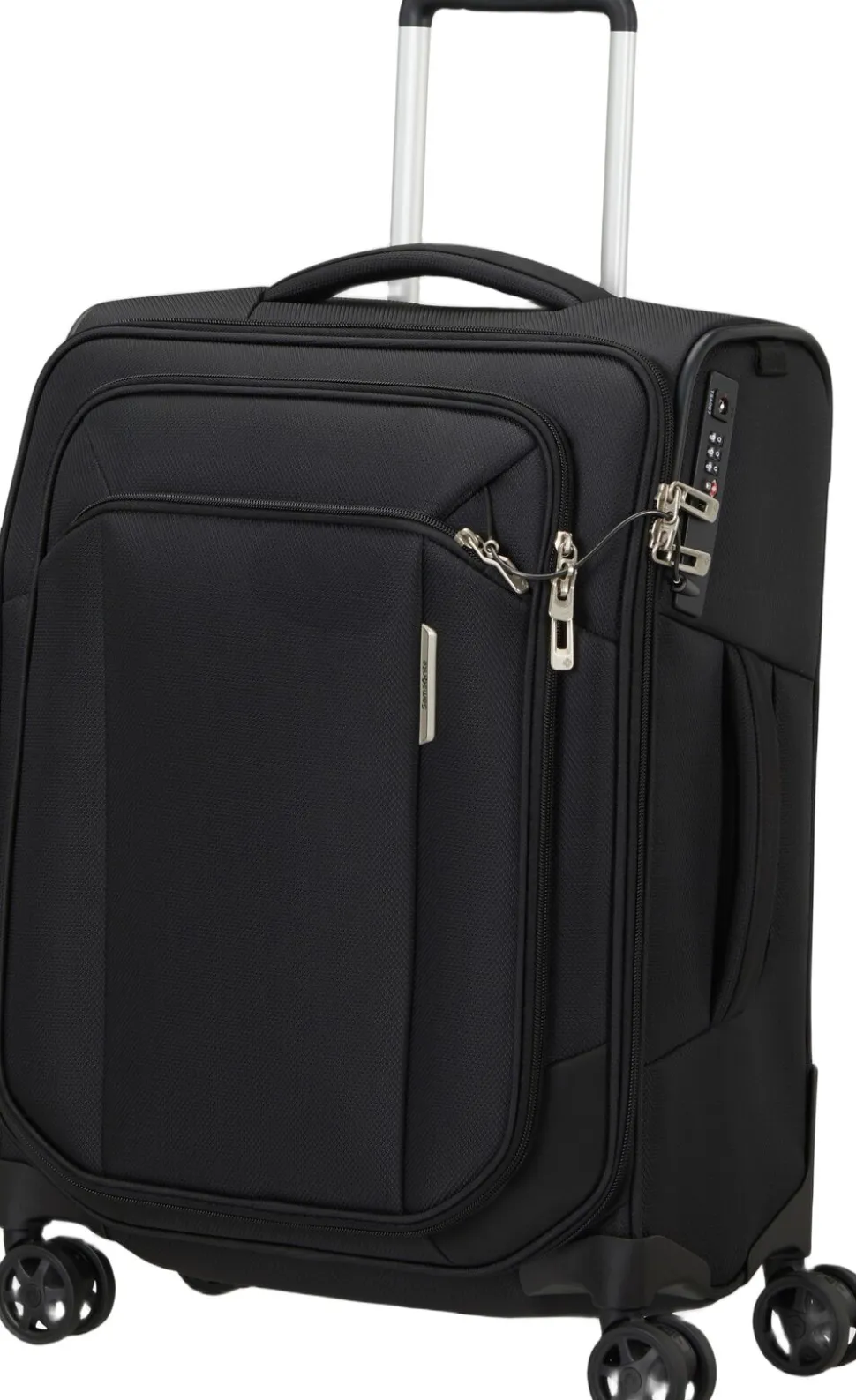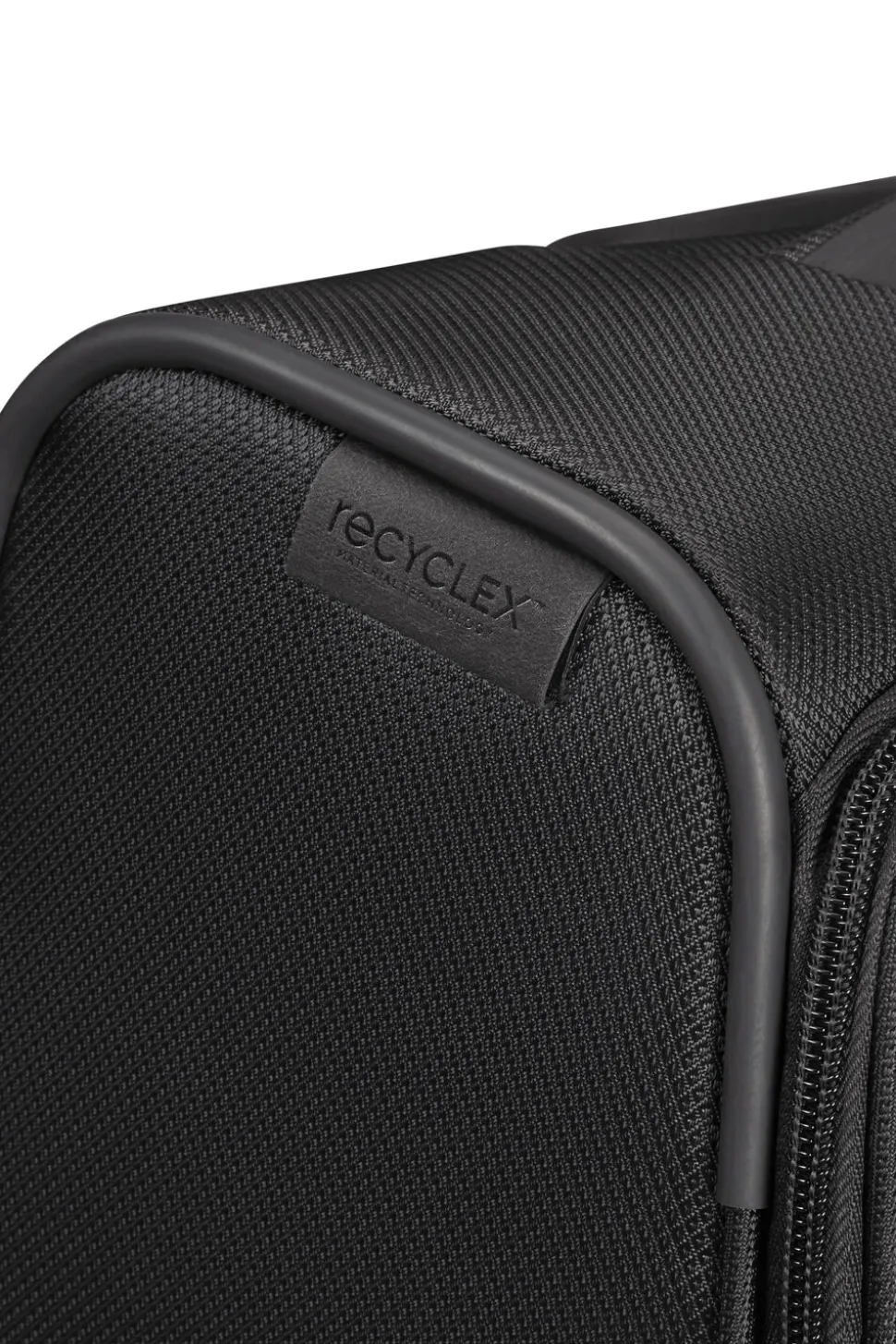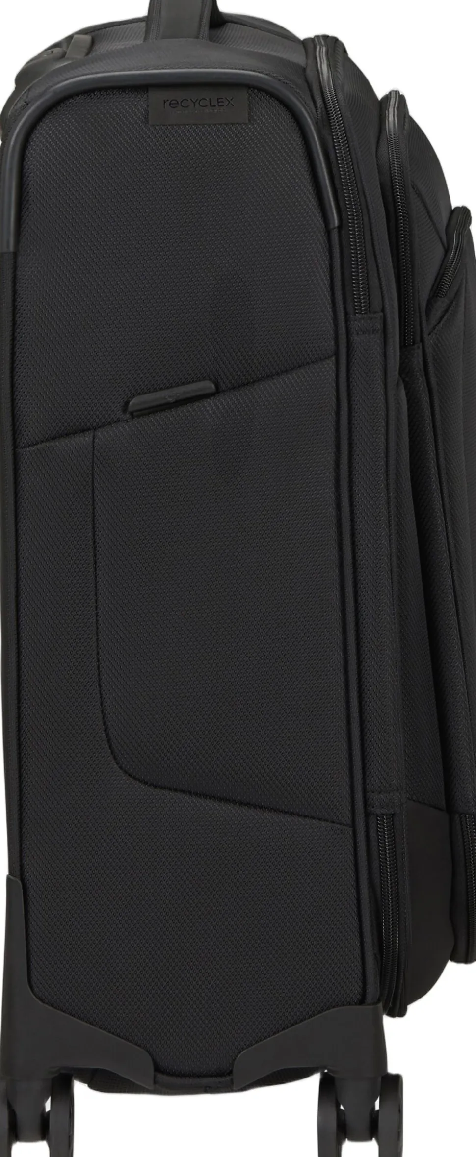 Kabinekuffert hvor både et indvendige og udvendige stor er lavet af genbrugte plastflasker, 4 dobbelte hjul, TSA lås , dobbelt trollystativ, navneskilt, låsbar frontlomme, vægt 2,4 kg,rumindhold 43 l, 5 års garanti,55x40x20 cm.