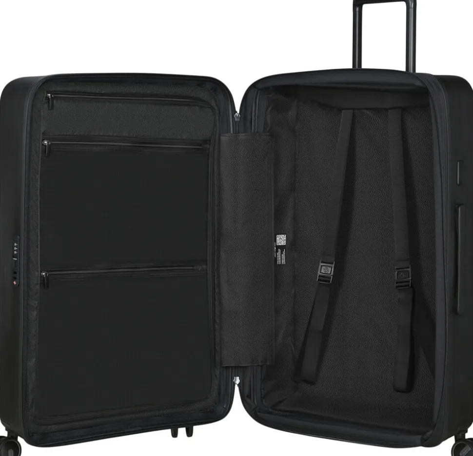 Kuffert med mulighed for udvidelse,indeholder 3 pakkeposer, mulighede for personalisering med de medfølgende stickers, polypropylen,4 hjul,TSA lås , indvendig stofforring lavet af genbrugte plastflasker, dobbelt trollystativ,navneskilt, vægt 3,9 kg,rumindhold 99/109 l, 5 års garanti,75x51x29/32 cm.