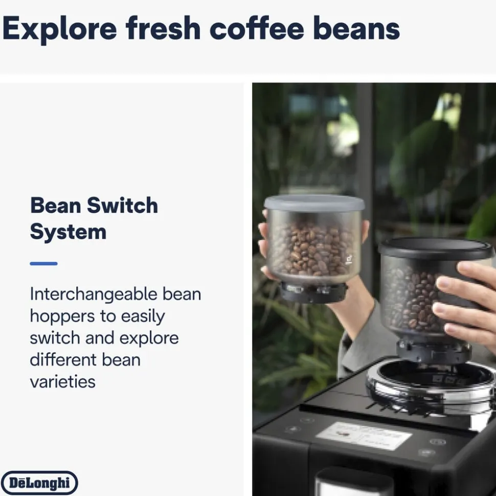 Dyk ned i kaffens univers med Rivelia og udforsk en mangfoldighed af bønnevarianter ved hjælp af Bean Switch System. Nyd en luksuriøs kaffeoplevelse gennem det 3,5″” fuld-touch farvedisplay, der præsenterer levende animationer og skræddersyede kafferutiner. Den kompakte maskine, med manuel mælkeskummer, skaber cremet skum og tilpasser sig din personlige stil.Bean Switch System åbner døren til uendelige kaffesmage, hvor Rivelia leveres med to udskiftelige tragte på 250 g, så du let kan variere dine kaffesensationer. Brug Skift-tilstanden før udskiftning for at tømme kværnen for de nuværende bønner. Vælg mellem at brygge en kop kaffe eller male bønnerne til side, og skab en rig kaffeoplevelse skræddersyet til dig.Nyd det intuitive 3,5″” fuld-touch farvedisplay med rige animationer, der lærer din kafferutine at kende og tilpasser din menu i løbet af dagen. Med op til 4 brugerprofiler giver Rivelia en personlig kaffeoplevelse. Bean Switch System gør det nemt at udforske forskellige bønner, mens Bean Adapt-teknologien tilpasser kværnegrad, kaffedosis og infusionstemperatur til dine valgte bønner.Mærk magien af 8 one-touch drikkevarianter via det intuitive display, og skab lækkert, cremet mælkeskum manuelt til at fuldende dine mælkebaserede drikke. Alt dette præsenteret i et elegant og kompakt design med bløde kanter, der oser af Sort Onyx.