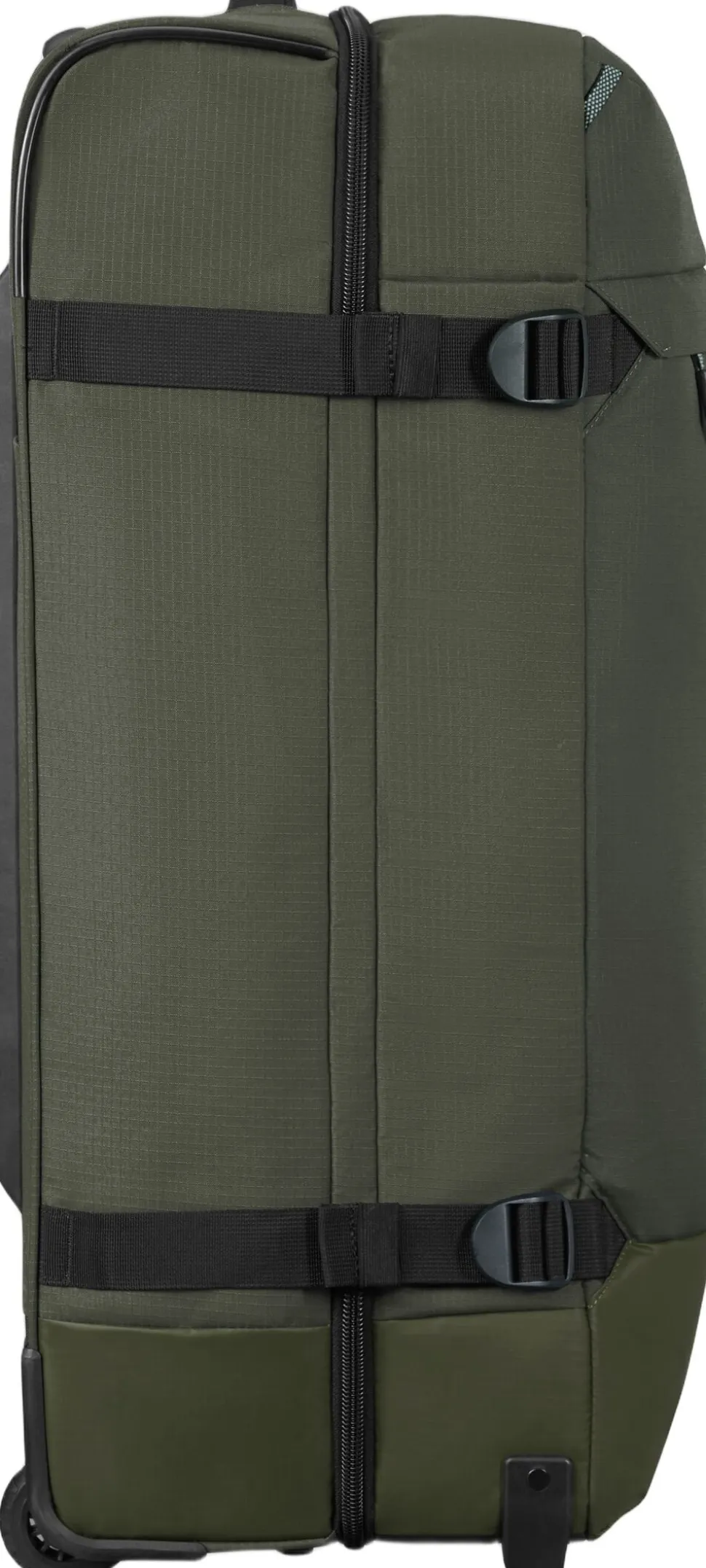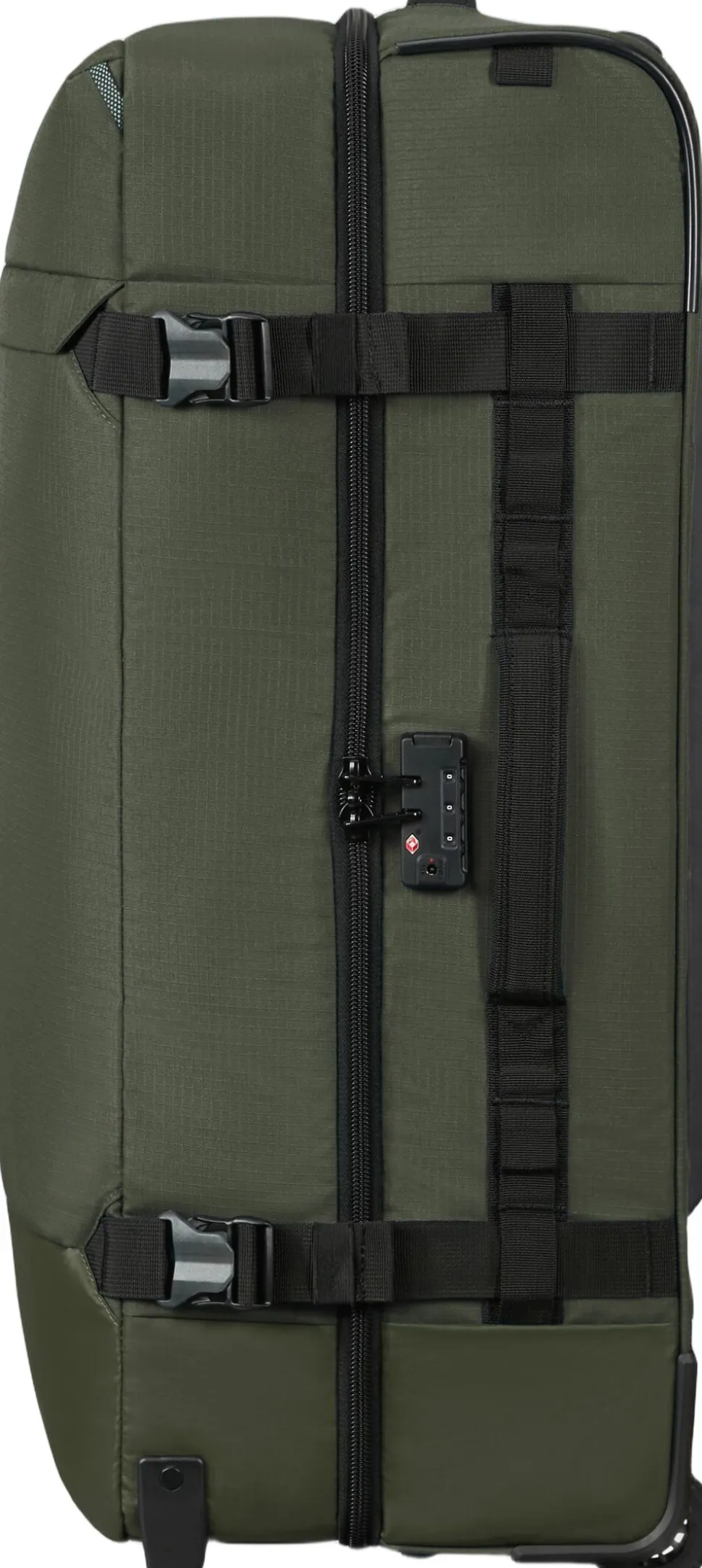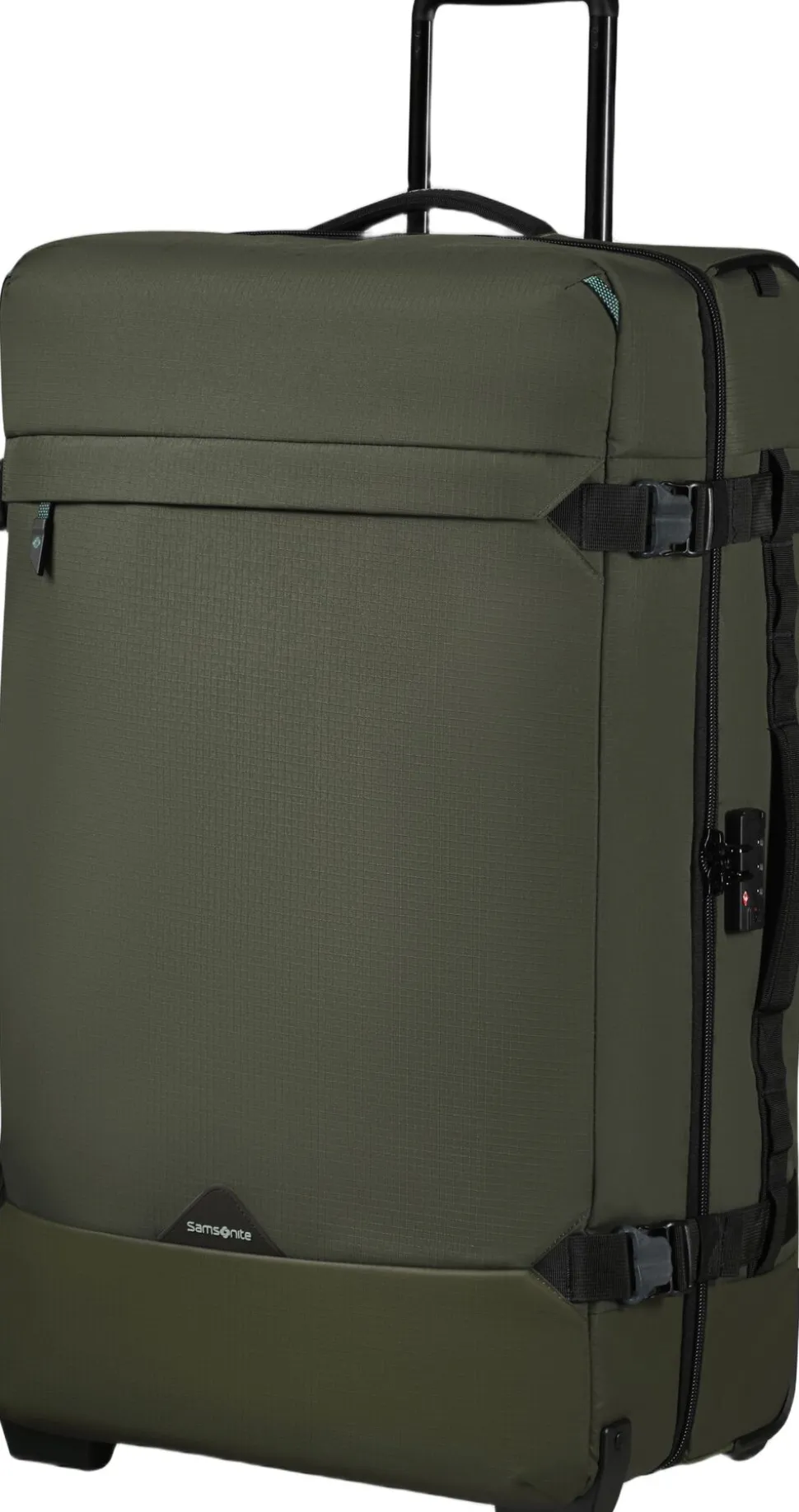 Rejsetaske med hjul, både det indvendige og udvendige stof er lavet af genbrugsplast, frontlomme med lynlås, TSA lås, indvendig krydsbånd og skillerum med lynlås, rumindhold 116 l, vægt 3,2 kg. 5 års garanti.