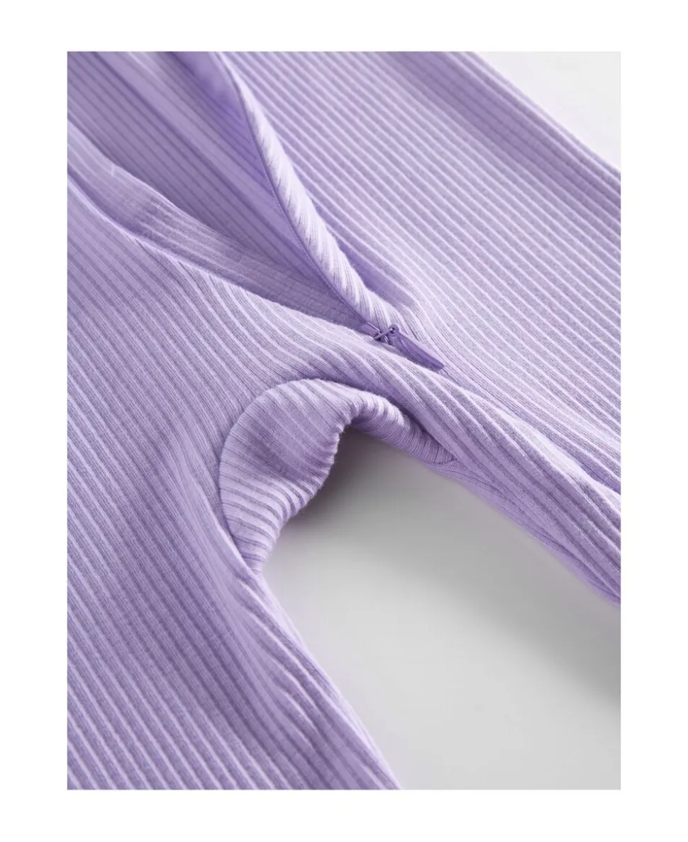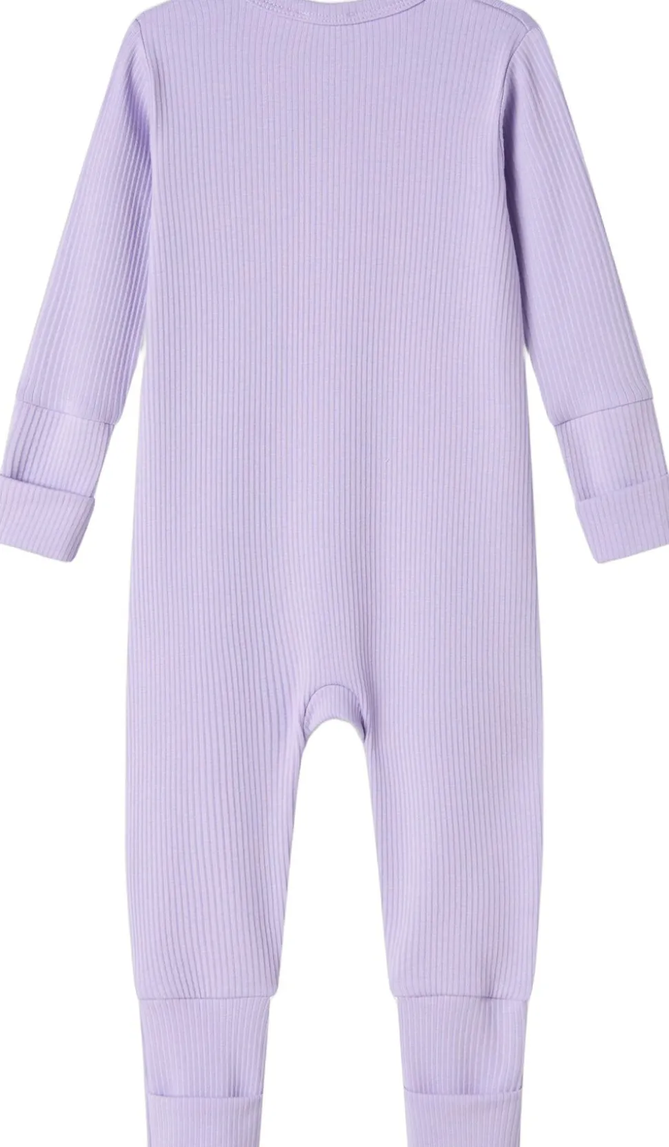 Enkel langærmet heldragt der kan lynes helt fra hals og ned langs det ene ben med lynlås for nem bleskiftning. Heldragten har ombuk ved både ærmer og ben, som kan justeres i takt med barnets væks. Heldragten har ydermere foldbar vante/strømpe funktion fra str. 2-4M. Heldragten er ribstrikket, blød, strækbar og behagelig at have på.