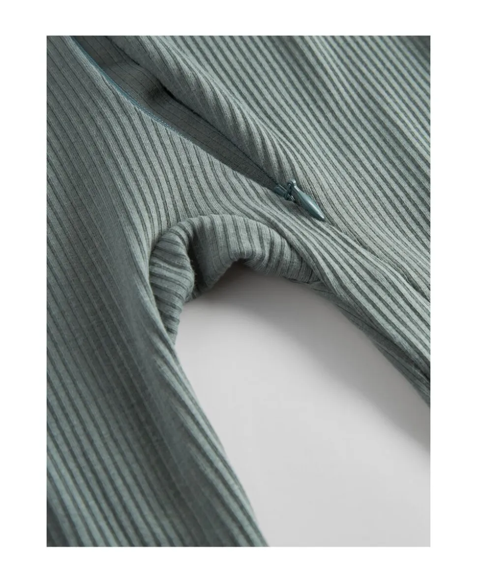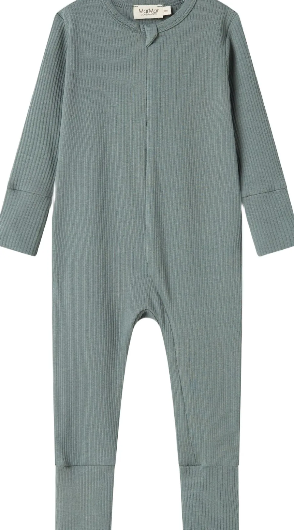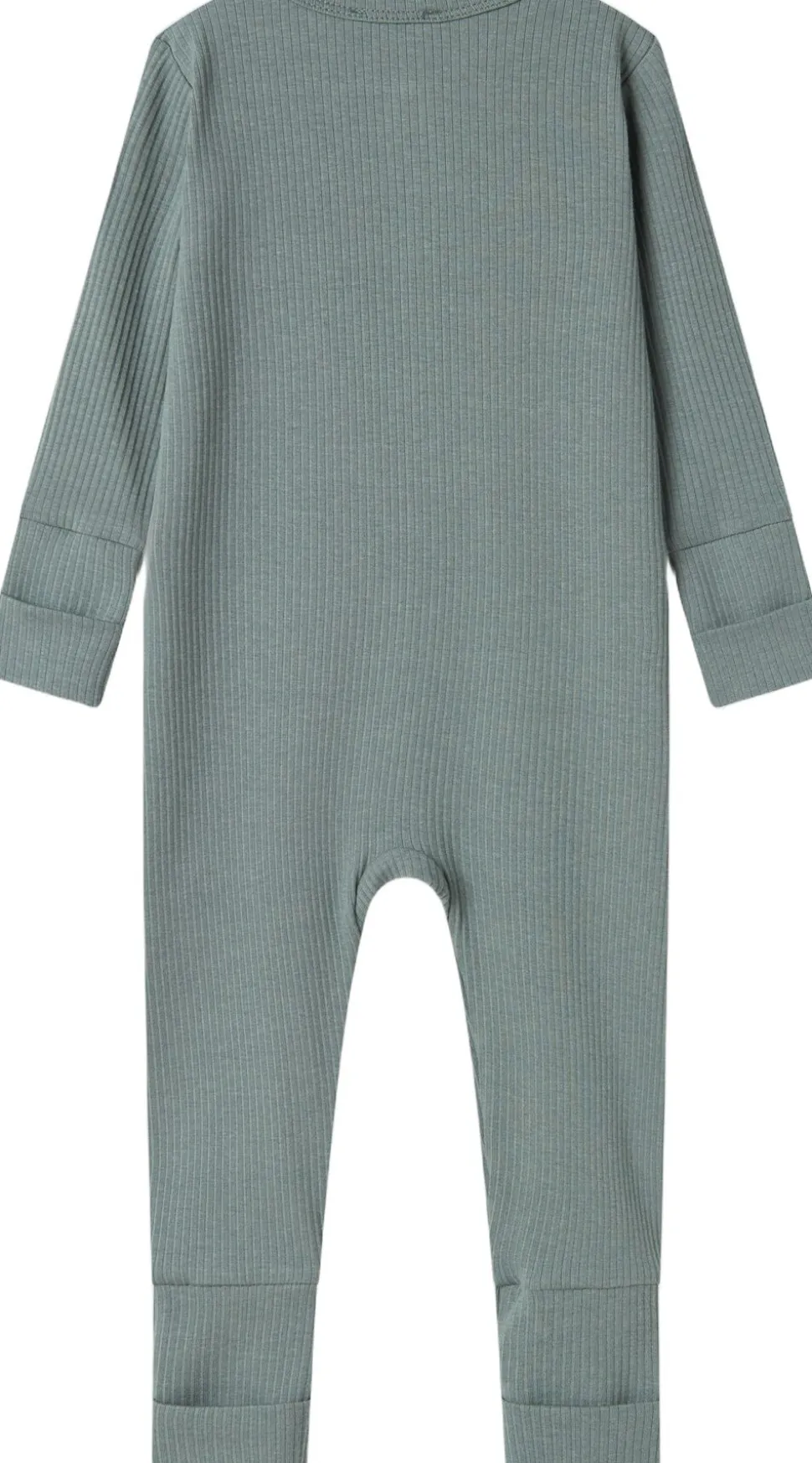 Enkel langærmet heldragt der kan lynes helt fra hals og ned langs det ene ben med lynlås for nem bleskiftning. Heldragten har ombuk ved både ærmer og ben, som kan justeres i takt med barnets væks. Heldragten har ydermere foldbar vante/strømpe funktion fra str. 2-4M. Heldragten er ribstrikket, blød, strækbar og behagelig at have på.