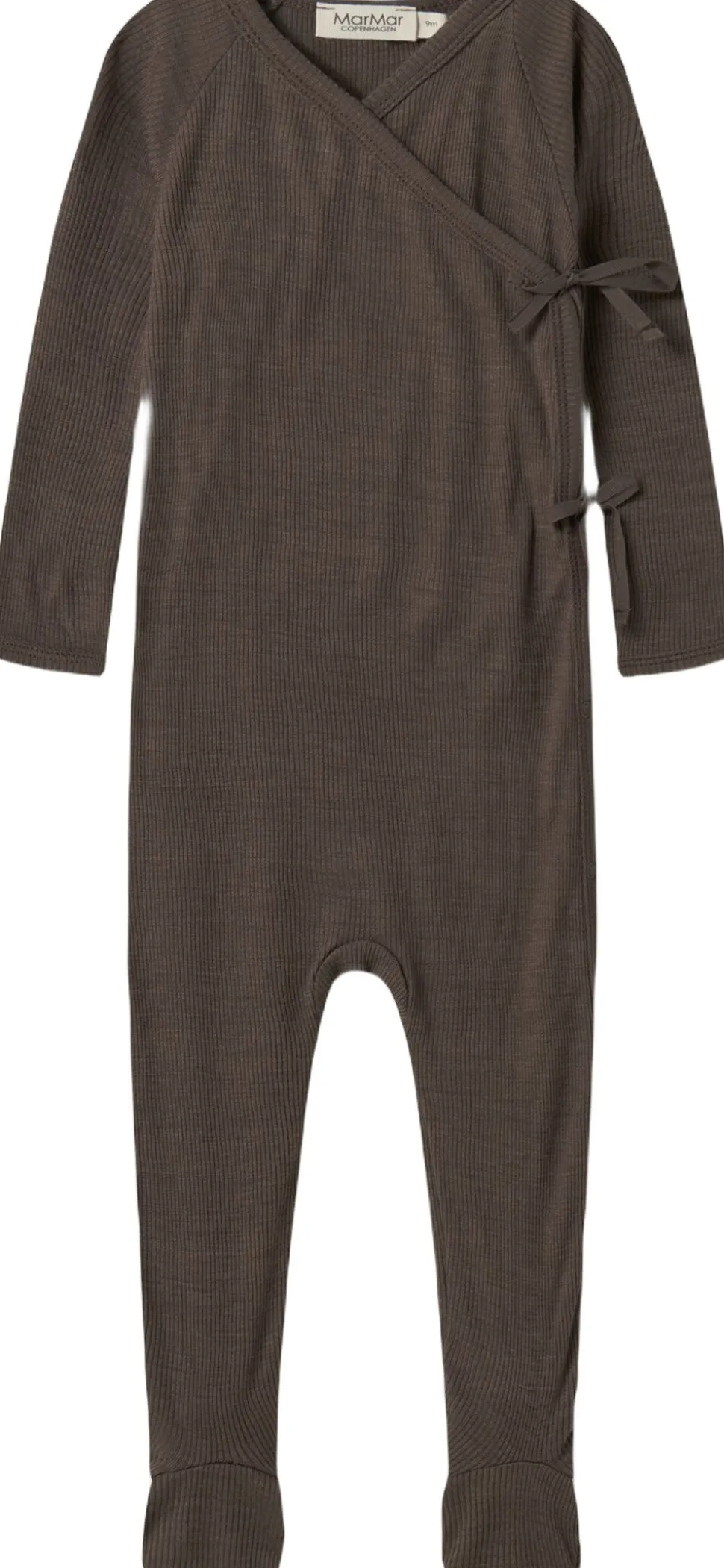 Langærmet heldragt med fødder til nyfødte. Heldragten har slå-om-lukning og lukkes med trykknapper og bindebånd
