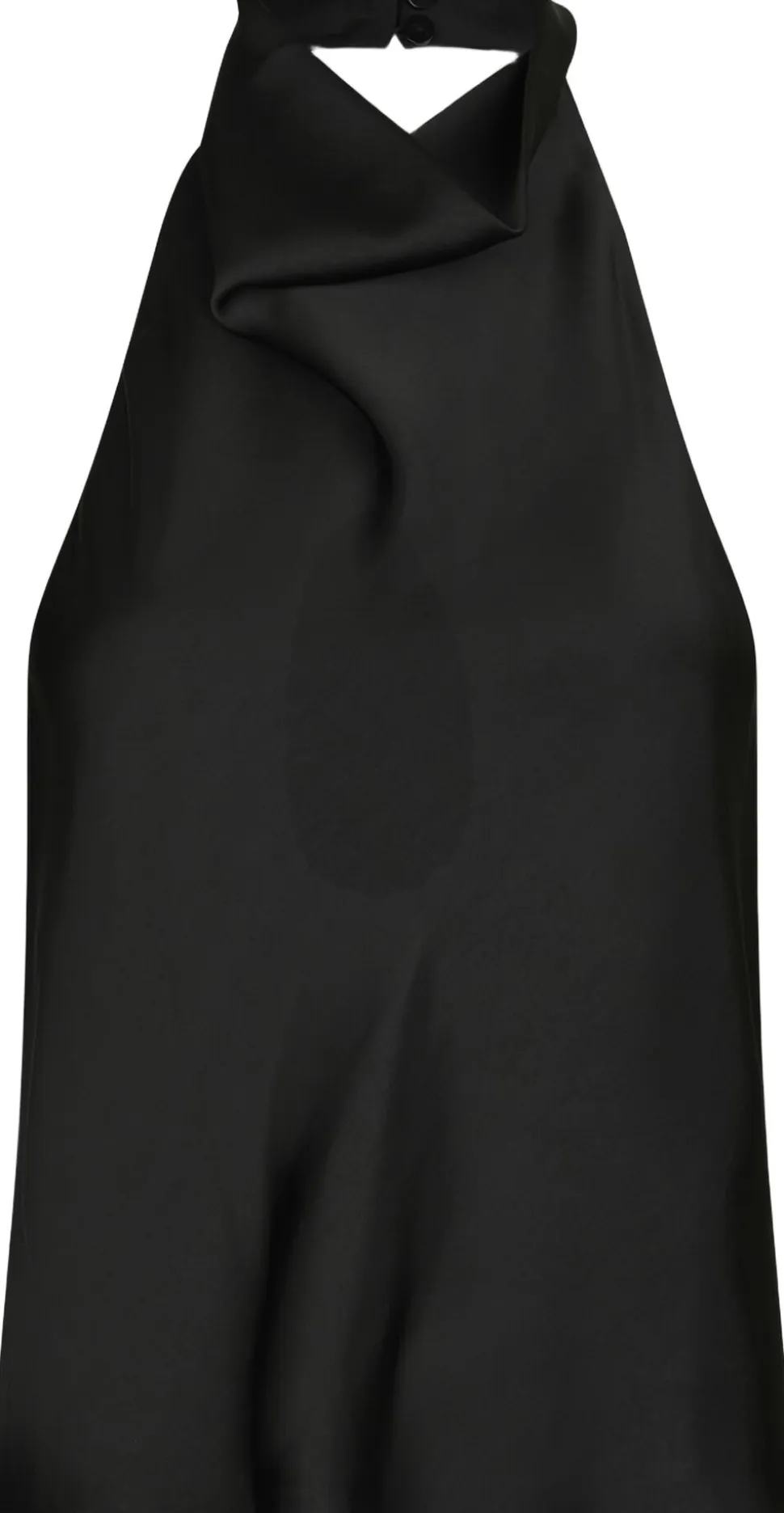 Ærmeløs top i satin. Toppen har en høj hals med vandfaldseffekt og en dyb, åben ryg. Den lukkes med knapper i nakken. Pasformen er almindelig. Modellen er iført størrelse 36.