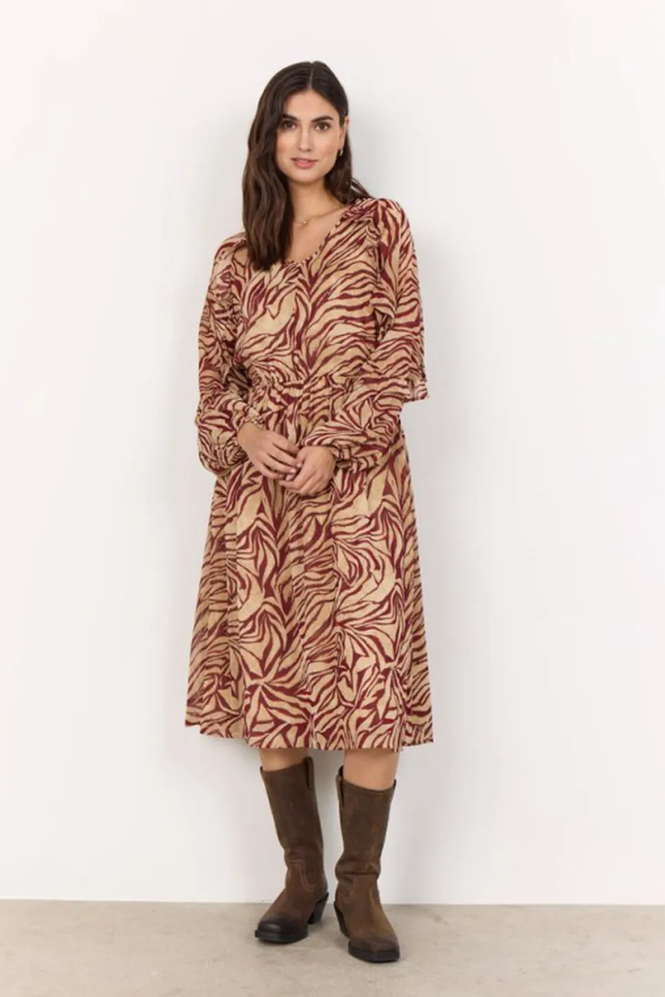 SC-VALBORG 2 Dress er fremstillet af 100 % genbrugspolyester. Den har V-udskæring, lange ærmer med rynkede manchetter og en afslappet, halvlang pasform med et dristigt, abstrakt print. Sæt den sammen med ankelstøvler og en crossbody-taske for et stilfuldt look.