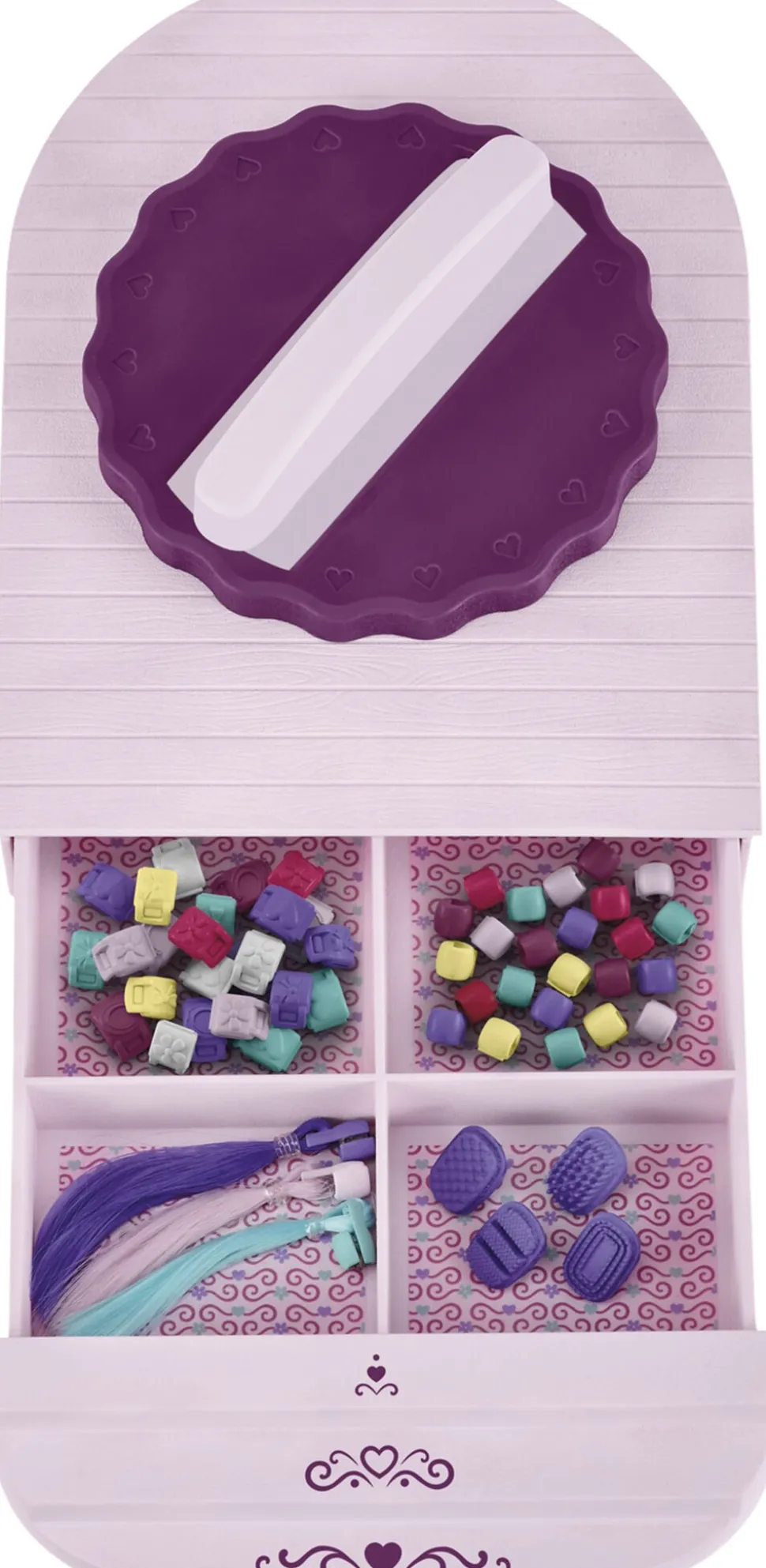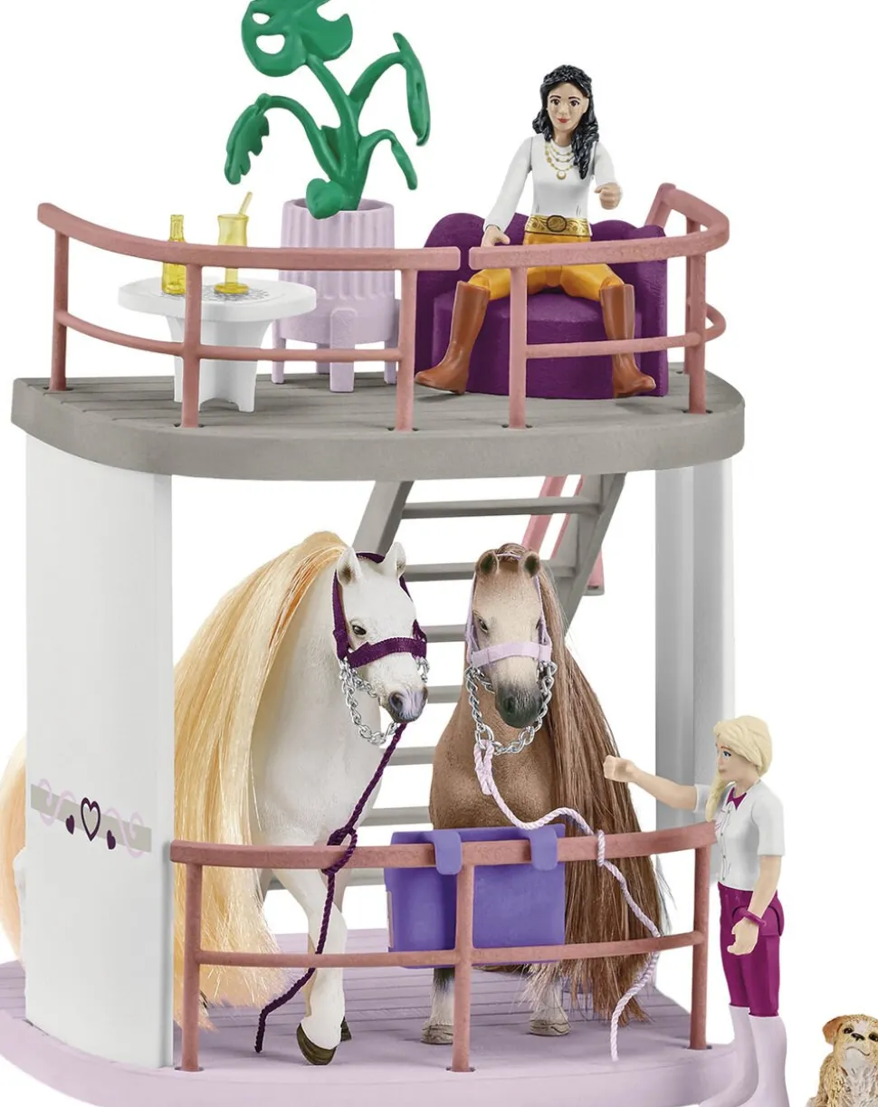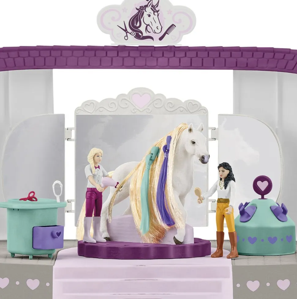 Pyh Med sådan et udvalg er det svært at vide, hvad man skal vælge staldfest, hestefødselsdag eller den første skoledag for det yngste føl Beauty-salonen fra Schleich HORSE CLUB Sofias Beauties har alt, hvad man kan drømme om til enhver hestebegivenhed Og takket være skrædderværkstedet kan alt tilbehør også laves efter mål Så små føl, sporty ponyer og stærke hingste kan stolt præsentere deres nye outfit på podiet Nedenunder er der en skuffe, hvor alt hårtilbehør, spænder og perler kan opbevares Vidste du, at du nemt kan udskifte og rede alle hestenes manke og hale? Ikke dårligt, vel? Og efter al den optræden fortjener dyrene masser af frisk hø i det hyggelige venteområde Der er endda kølig limonade Men det er kun til rytterne