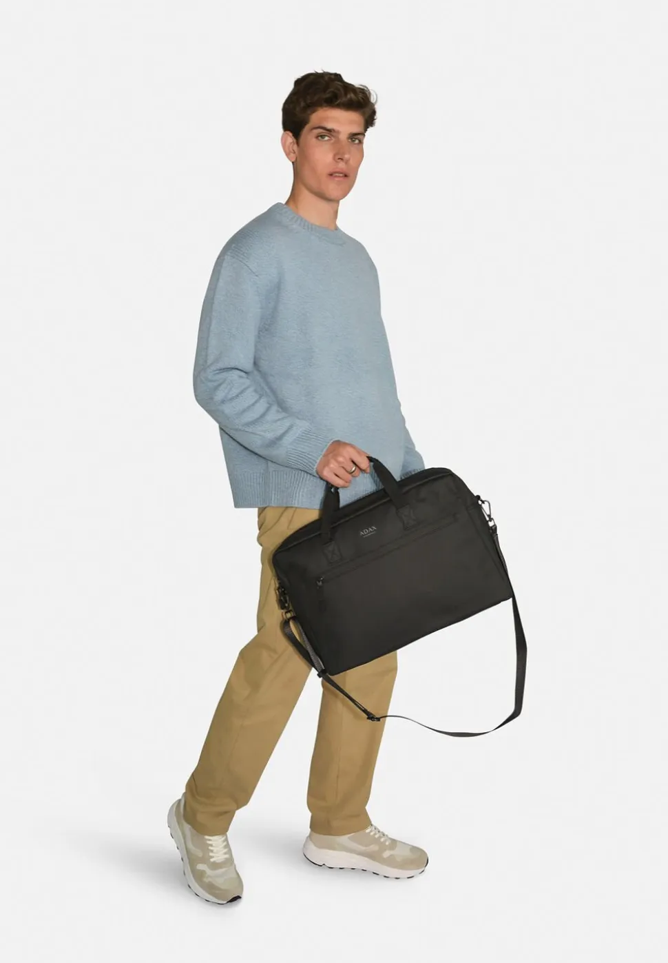 Niki portfolio fra serien Senna er en smart portfolie i vandafvisende nylon. Portfolien har på fronten en lynlåslomme og på bagsiden en strop så man let kan montere tasken på en trolly. Portfolioen har 2 seperat rum, som lukkes med lynlås itoppen. Indvendig findes der en foret lomme med plads til en laptop og i det andet rum en lynlåslomme til småting samt små stiklommer til telefon, kuglepenne mc. Portfolien kan både bæres i de to hanke eller i den lange regulerbare rem. Holder tør ved moderat regn over en kort periode eller let regn over en længere periode. Vandsøjletryk >5000.