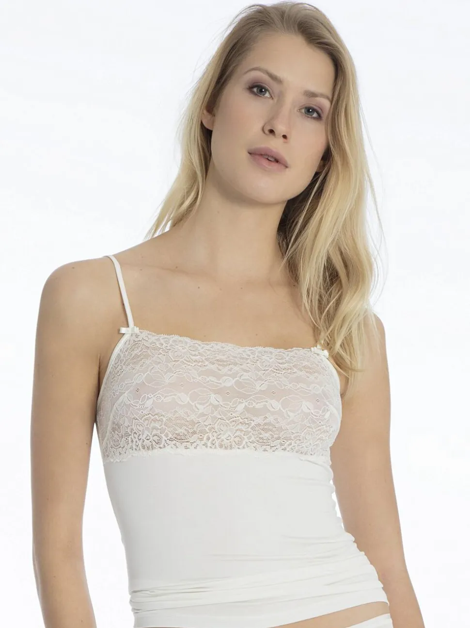 Top fra Calida i den fineste bløde kvalitet med blondestof over barmen. Toppen har smalle og justerbare skulderstropper med søde sløjfer på fronten, og derudover har den en tætsiddende pasform. Kombiner fx denne feminine top med et par matchende blondetrusser.