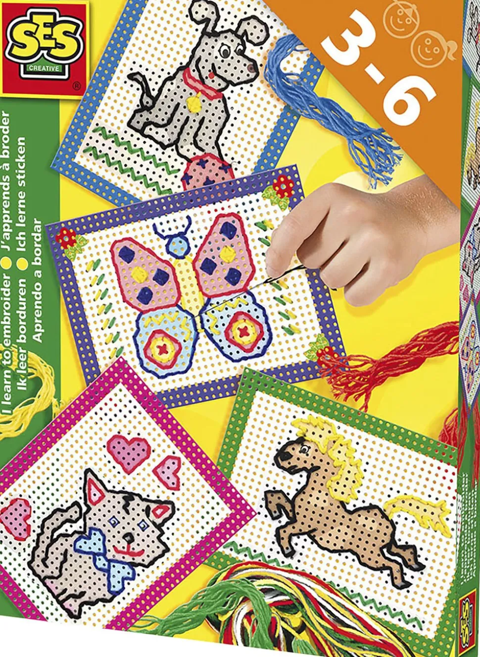Indhold: 4 fortrykte broderikort (perforerede), Broderenål + fingerbøl, Tråd: sort, rød, blå, gul, grøn.