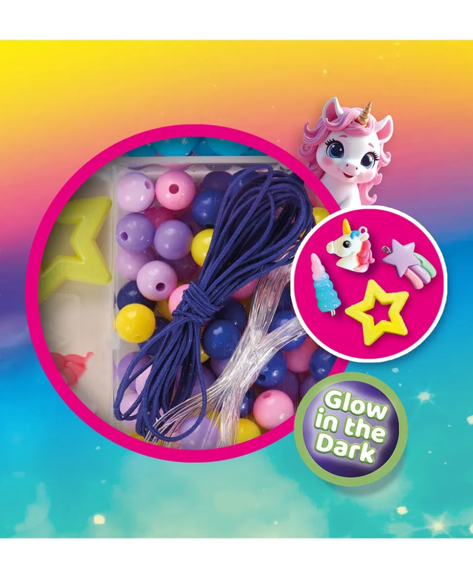 Smykkesæt bestående af en opbevaringsæske med 12 rum fyldt med smukke perlemorfarvede og selvlysende perler, der kan lyse i mørke, samt 4 vedhæng med enhjørninger, der kan gøre kreationerne ekstra specielle.