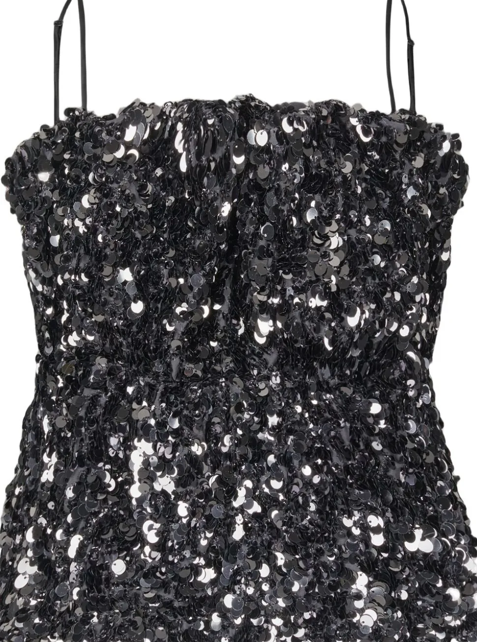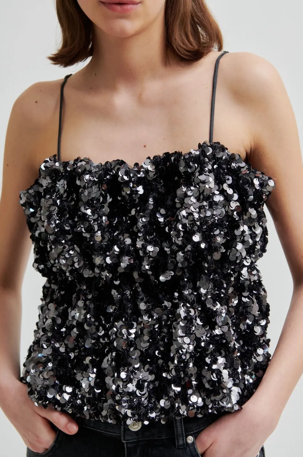 Second Female stroptop med pailletter. Toppen har pailletter i forskellige størrelser på en tone-i-tone-baggrund. Smalle stropper med justerbare spænder og elastiske sømme under brystet. Helforet. Tæt