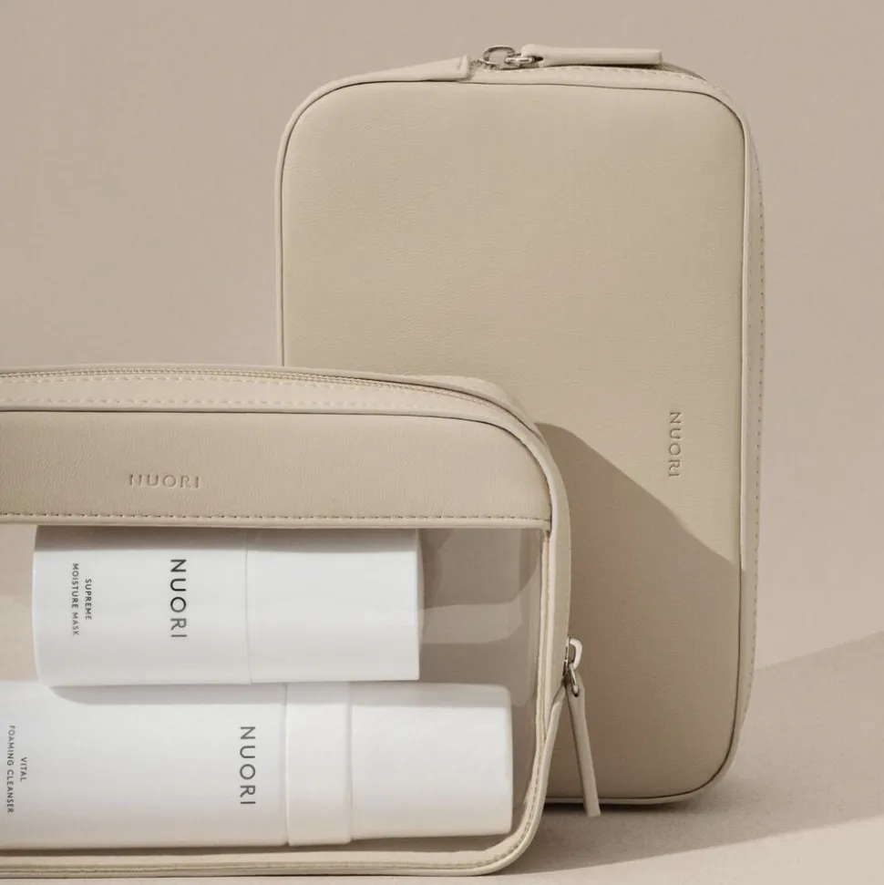 Et sæt af to stilige og elegante tasker, som består af to dele, der holdes sammen med usynlige magneter. Tasken i vegansk læder kan også bruges som en “clutch”, mens den gennemsigtige er internationalt godkendt til væsker under flyrejsen. Findes i fire signaturfarver: Neutral, Rosa, Havblå og Sort.