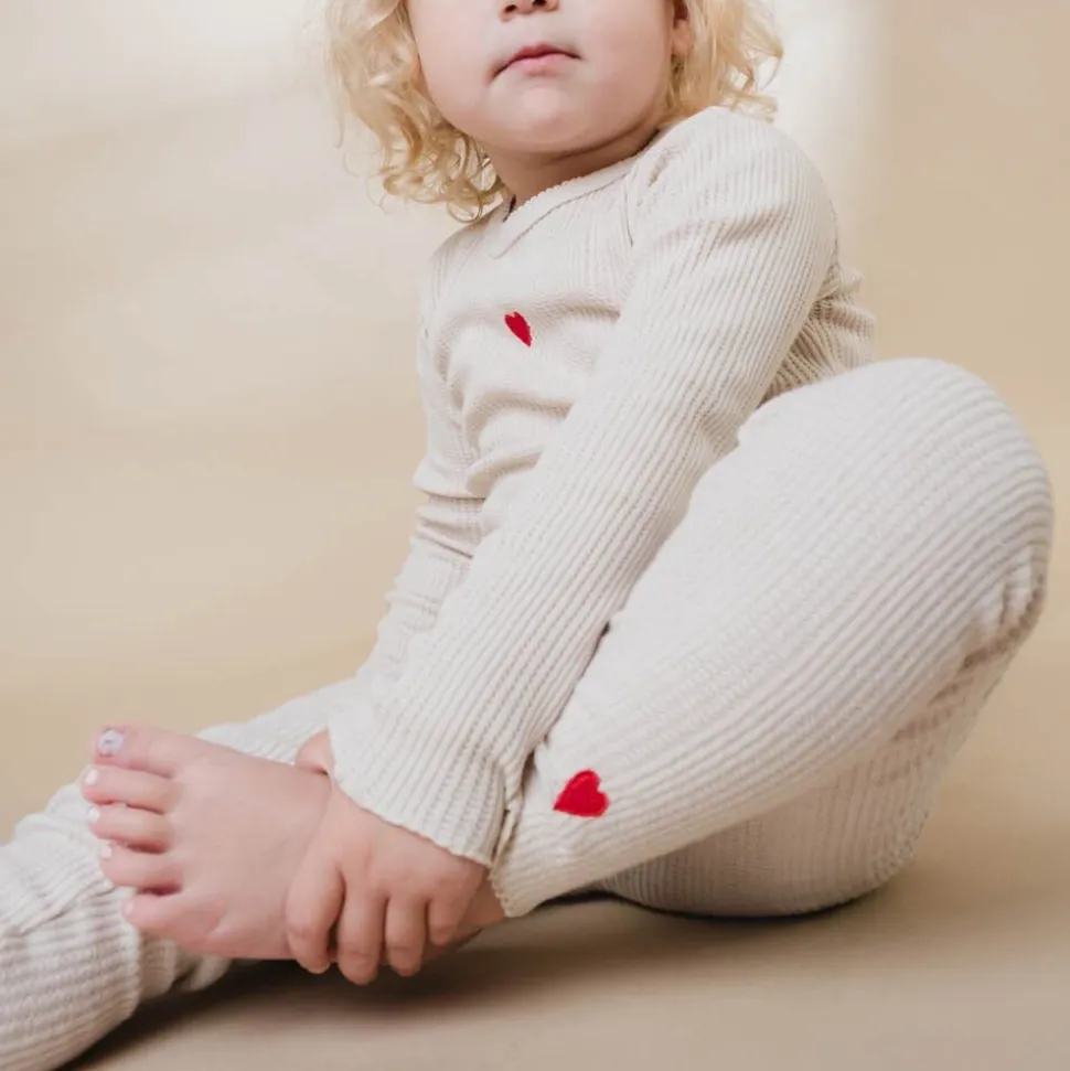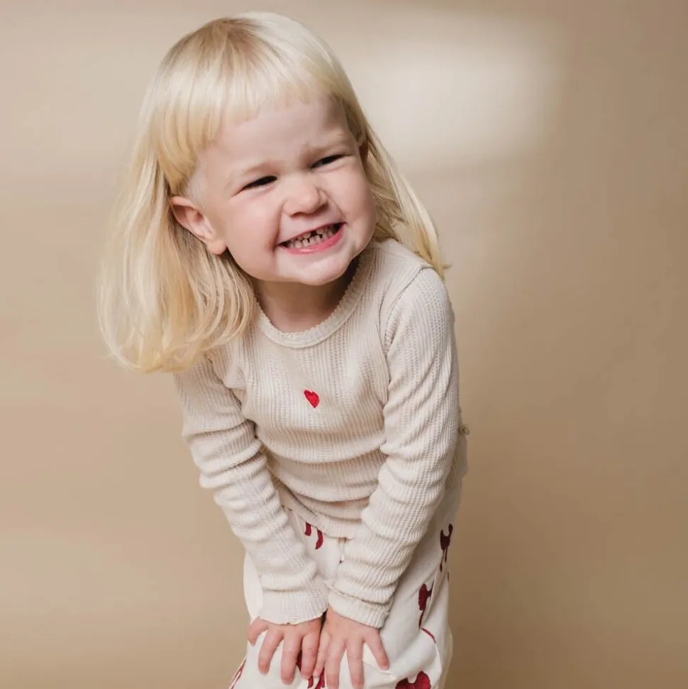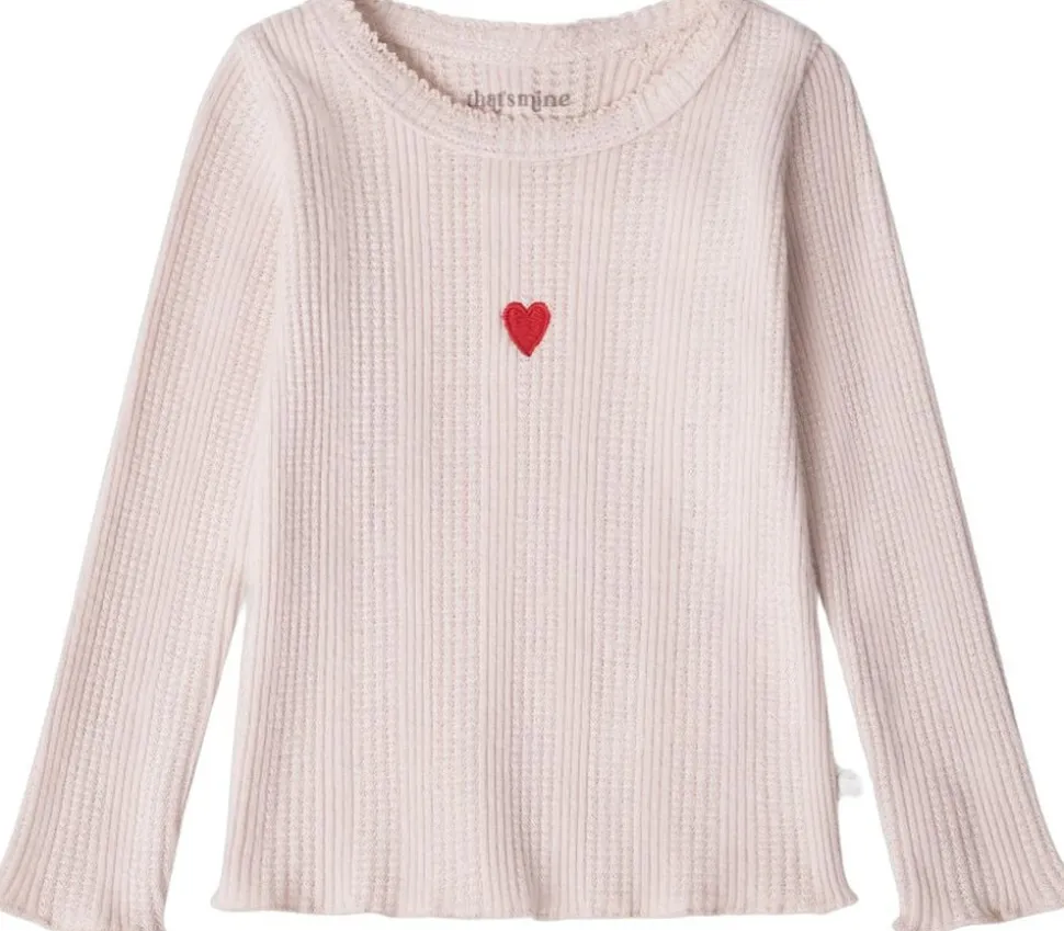 Fin langærmet t-shirt i børstet pointelle med hjerte foran. Lavet af økologisk bomuld. T-shirten kan fuldendes i et nuttet sæt med Sylvia leggins