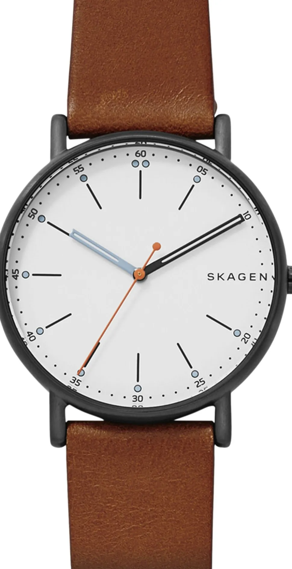 SKAGEN SIGNATUR Sort herreur i rustfrit stål med brun læderrem. Hvid urskive. For mere info se FAKTA. Skagen er et moderne livsstilsmærke med enkelhed, formål og tilgængelighed som særlige kendetegn. Skagen kombinere inspirationen fra dansk design med funktionalitet og skaber produkter af høj kvalitet. Water protection beskrivelse: 3ATM Vandsprøjt – men ikke badning. 5ATM Vandsprøjt – men ikke badning. 10ATM Badning – men ikke dykning.