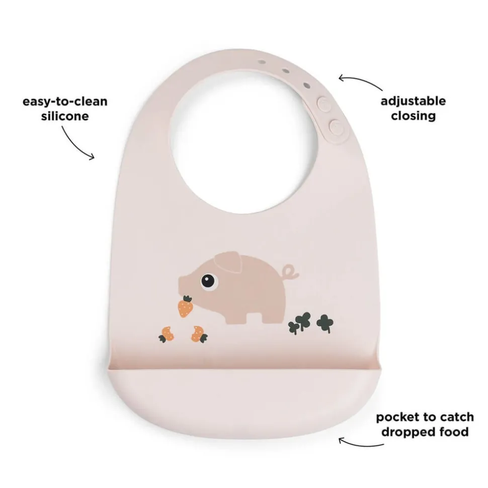 Hagesmækken har en lomme til at fange tabt mad