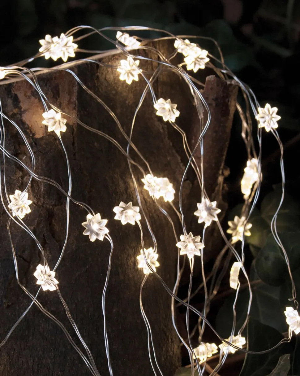 Sirius Lyskæden Silke har 40 meget små fine (0,5 cm) LED lys. På kæden er der påsat 40 små (1cm) klare blomster. Kæden er lavet med en fin sølvtråd der er snoet rundt om den transprarente ledning. Meget dekorativ kæde. Kæden er 3,9 meter lang, og har et varmt naturligt lys. Dekorationen er batteridrevet og har en indbygget timerfunktion, der slukker lyset automatisk efter 6 timer, hvis du ikke selv slukker dem. Efter 18 timer tænder lyset igen, og sådan vil det fortsætte, hvis du ikke bruger sluk knappen. Batterier medfølger ikke. Der skal isættes 2 AA Batterier. Kan kun benyttes indendørs.