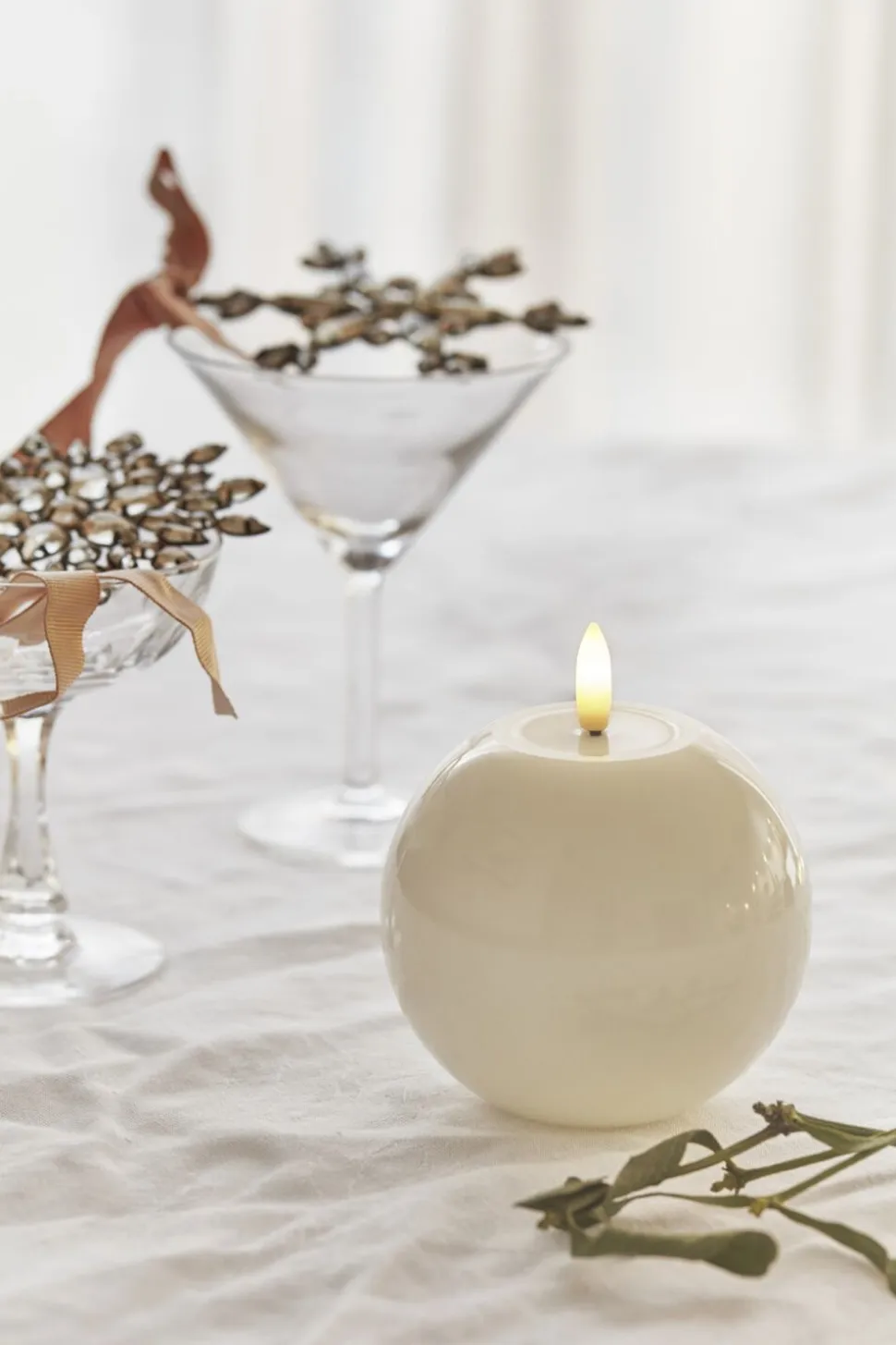 LED lak kuglelys med 3D flamme der lyser med et varmt hvidt lys