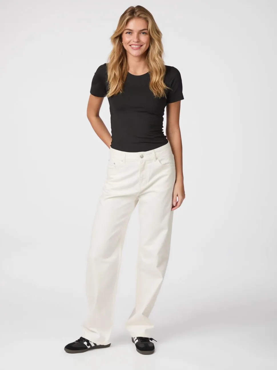 Jeans med mellem-høj talje og lige ben. De har bæltestropper i taljen, klassiske 5-pockets og lukkes med en knap samt skjult lynlås. Jeansene har et loose fit og er lavet i en ikke-strækbar bomuldskvalitet. Modellen er iført størrelse 36.