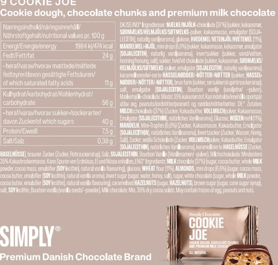 COOKIE JOE Cube m/ 9 bites. Omringet af premium mælkechokolade møder du et indre af hjemmelavet cookiedej med chokoladechunks og ekstra chokoladekærlighed. Skabt tilchokoladeelskere, der søger den perfekte balance mellem cremet, sød og sprød. Forget the cookies, enjoy the dough. Premium kvalitetschokolade helt fri for kunstige