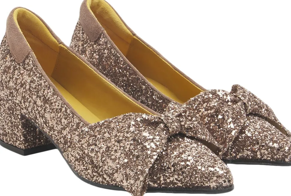 Sløjfepump i funklende glitter. Pumpen har en spids snude, ruskindskanter, polstret krave for ekstra komfort og støtte, vatteret indersål, læderfoer, sort tunitsål og en