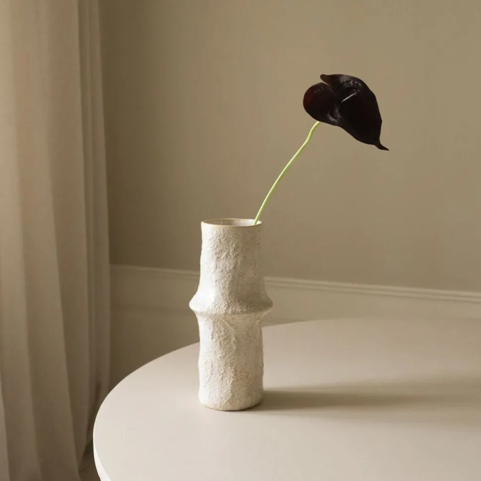 Denne sorte lille anthuriumblomst har en Single dyb, blank blomst med en rig sort nuance og diskrete burgundy undertoner. Den strukturerede spathe har naturlige folder, der centrerer sig omkring en delikat, fremspringende spadix.ÊBlomsten vises på en glat, slank grøn stilk, som måler 65 cm i højden, hvilket forbedrer dens yndefulde, forlængede profil. Den store keramiske jordvase på billedet måler 30,5 cm i højden og 10 cm i diameter.