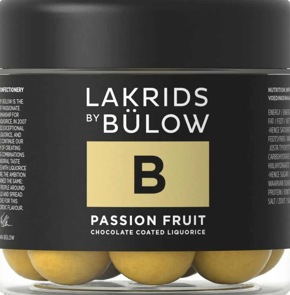 Sød lakrids iklædt nøje udvalgt hvid chokolade og forførende passionsfrugt. Chokoladens sødme, passionsfrugtens syrlighed og lakridsens evne til at forene smagsoplevelserne giver den perfekte mundfuld. Sødt, syrligt og suverænt – omsluttet af en delikat, sprød sukkerskal.