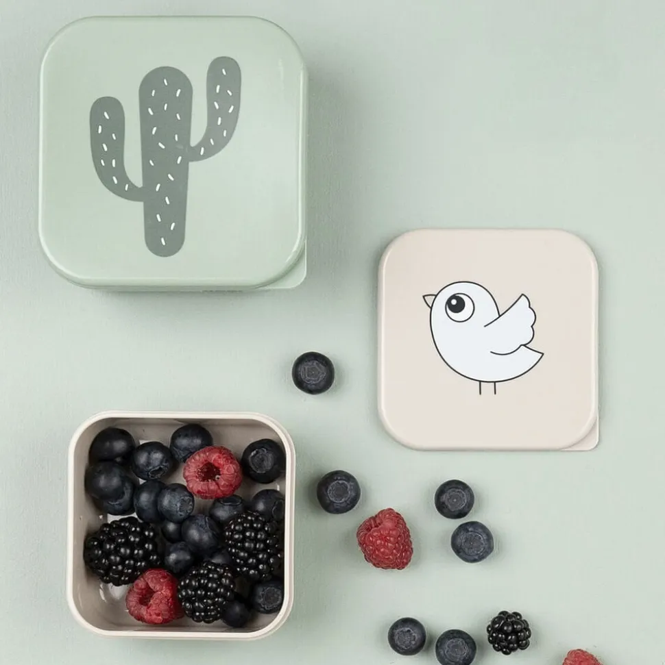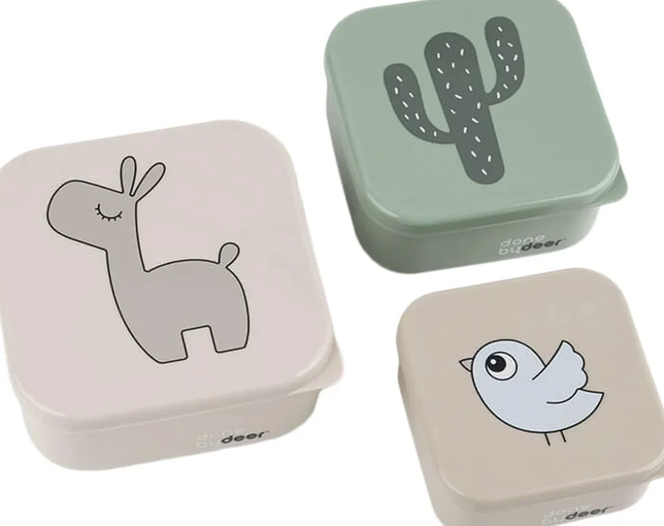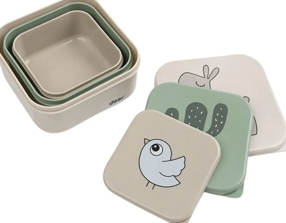 Snack box sættet med madkasser i tre størrelser er perfekt at have med på farten. Når I drager på eventyr – glem ikke snacks til ungerne! Madkasserne er praktiske til at opdele mad eller til farvekridt o.lign. Et perfekt sæt af Deer friends kasser til opbevaring af mad til børnehave, skole og når I tager på tur. Sættet består af en sandfarvet madkasse med Lalee, en grøn med en sjov kaktus og en sandfarvet snack-boks med den lille Birdee.