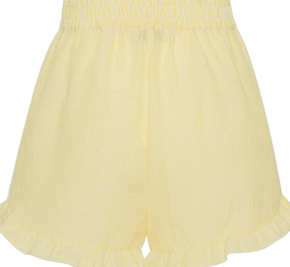 Sonja shorts er et par korte, Løs shorts i et stribet crepemateriale. De har elastik i taljen og en diskret flæsedetalje nederst. Shortsene er normale i størrelse – Kort – Elastisk bånd – Frill-detalje