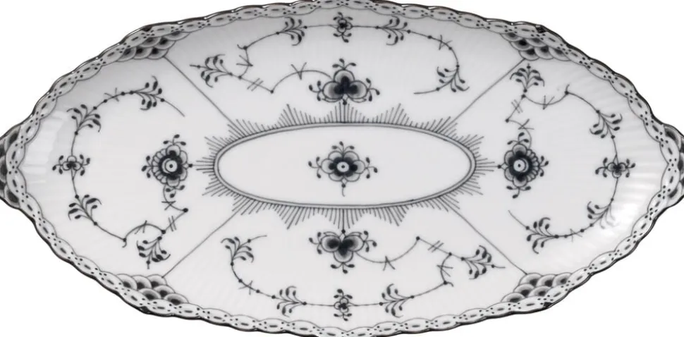 Baseret på en form fra Royal Copenhagens arkiv viser denne ovale asiet smukt den halvblondes forviklinger. Blondekanten følger nænsomt tallerkenens bølgede kant og tværs over overfladen folder det håndmalede blomstermønster sig ud. De elegante sorte dekorationer gør dette til et fantastisk og sofistikeret stykke porcelæn.
