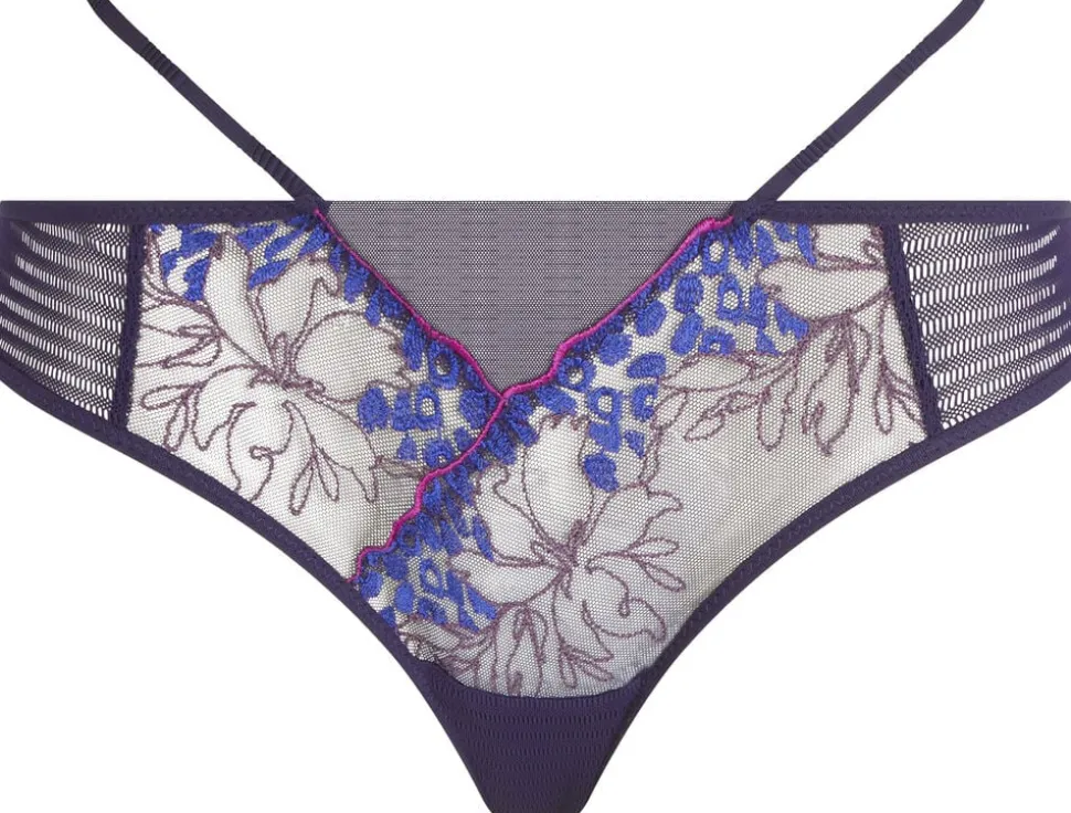 Spice fra Chantelles nye Pulp-koncept. Spice kombinerer neonfarver med natur-og blomstermotiver. Tanga trusse med fin effekt.