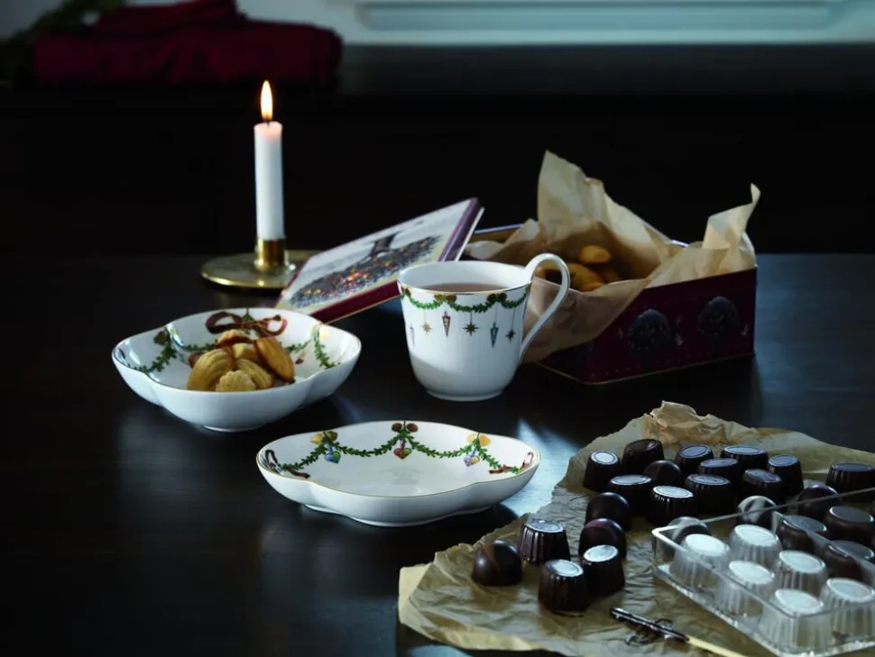 Blandt julens smukke traditioner hører julestellet fra Royal Copenhagen. På tallerkener, skåle og kopper snor granguirlanderne sig højtideligt, dekoreret med elegante silkesløjfer og det fineste pynt. Stjerne Riflet Jul skaber stemning og gør julen til noget helt særligt – generation efter generation. Hver eneste steldel er et smukt stykke julepynt i sig selv, og når bordet står dækket og lysene er tændt, så bliver det helt sikkert jul igen.