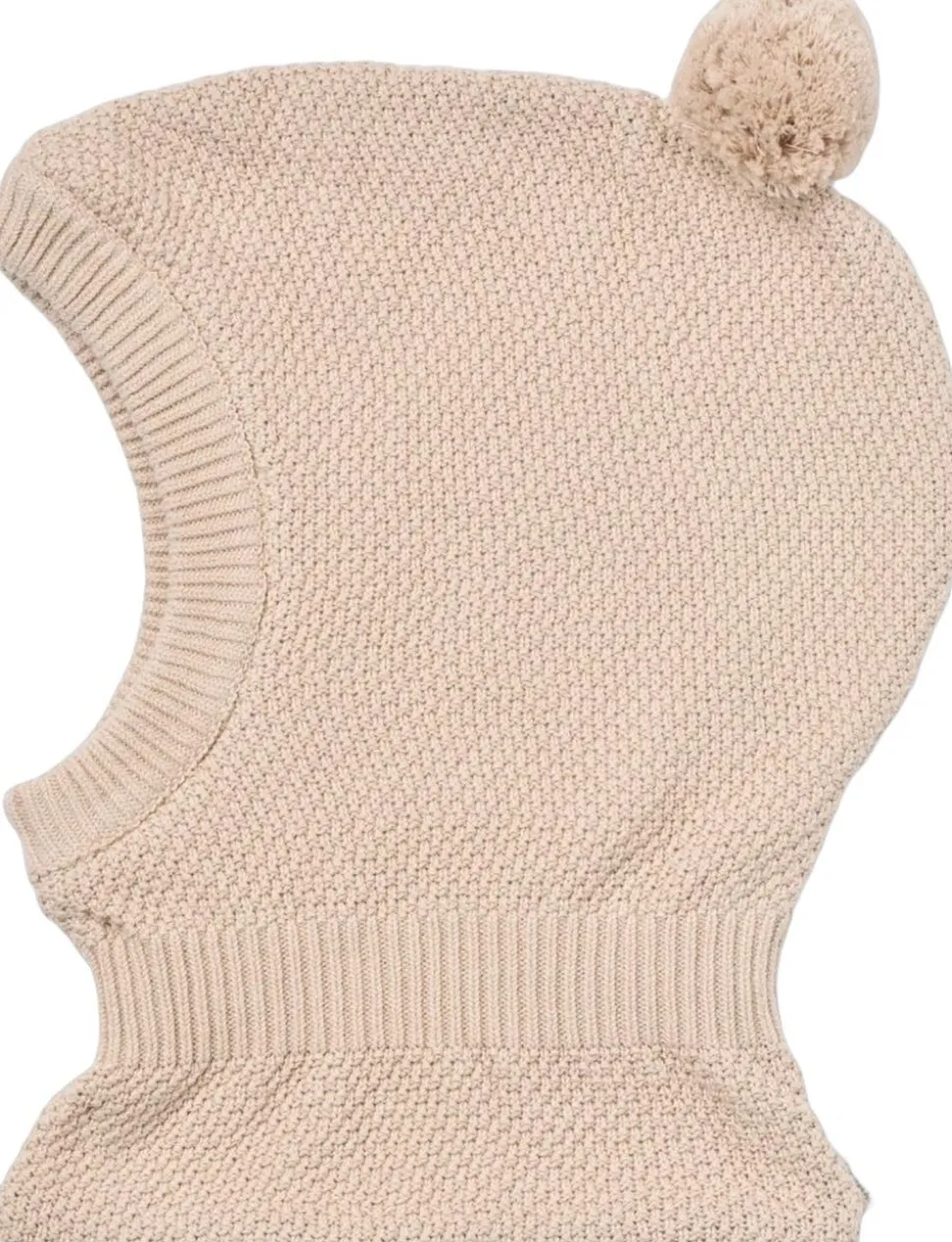 Fin strikket balaclava i blødt økologisk bomuld til dit barn. – Strukturstrik – Blødt for i økologisk bomuldsjersey – Kvast på toppen – Ribkant omkring ansigtet – Ribkant ved halsen Denne bløde balaclava er behagelig at have på og er perfekt til den kolde efterårs- og vintersæson. En sand nødvendighed for børn, der har brug for ekstra varme og beskyttelse omkring ørerne, hovedet og nakken, når de leger udenfor. — 100% Økologisk bomuld Foer: 100% Økologisk bomuld