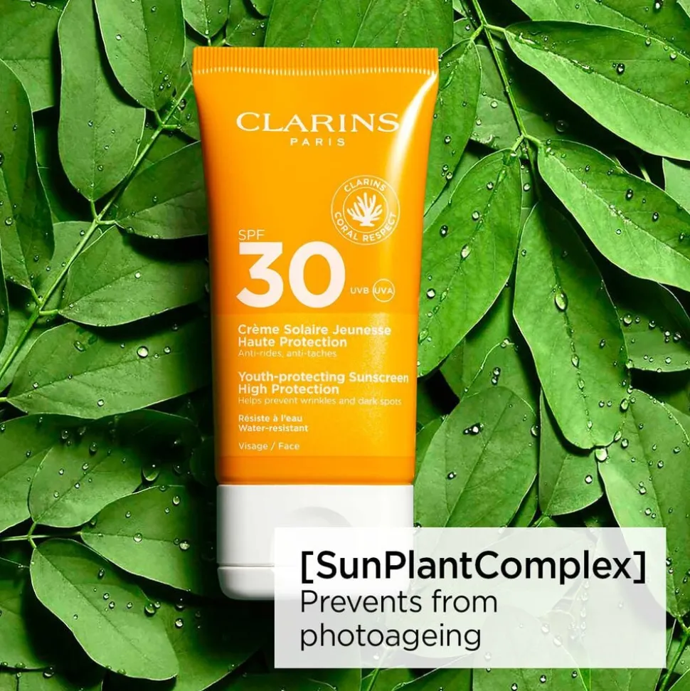 En høj beskyttende solcreme med faktor 30 til ansigtet. Beskytter mod UVA- og UVB-stråler. Giver en ensartet, holdbar og solbrun farve samtidig med at den beskytter huden mod sol-fremkaldte ældningstegn. Sådan bruges den: Gentag ofte indsmøring af sensitive områder. Smøres ind i et tykt lag, mindst hver anden time og altid efter svømning. Dens glatte, fine tekstur og hurtigt absorberende effekt hjælper med at fremme en mat finish. Få farven til at holde længere ved om aftenen at bruge Clarins After Sun Balm eller Gel. Clarins sol-serie er multi-cellebeskyttelse og beskytter huden mod sol-fremkaldte ældningstegn såsom linier og mørke pletter.