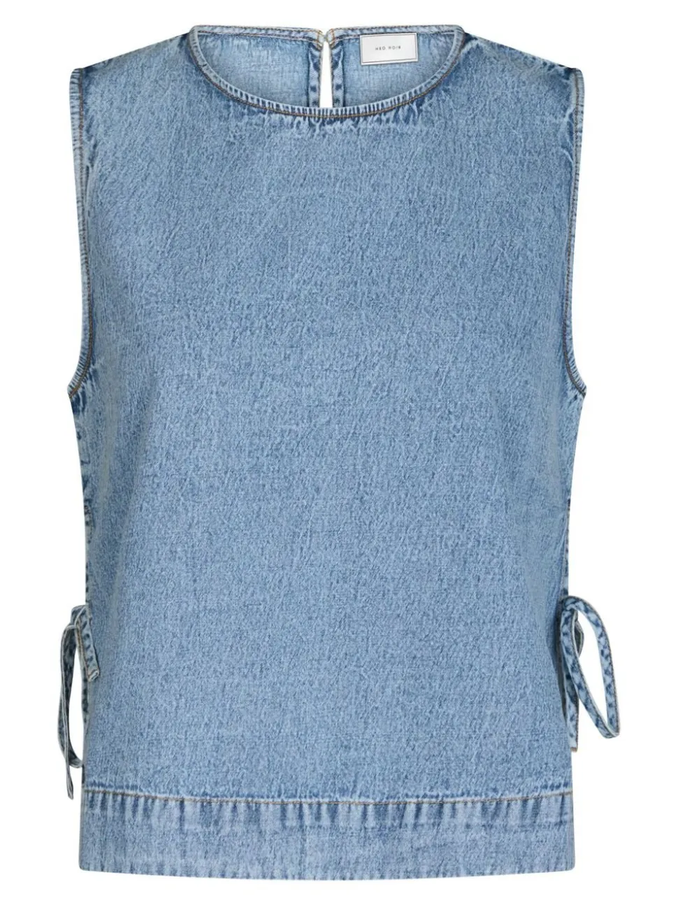 Kort denimtop uden ærmer. Toppen har en rund halsudskæring, slids med et justerbart bindebånd i siden og lukkes med en nøglehulslukning i ryggen. Den er lavet i en blød denimkvalitet i bomuld og har en løstsiddende pasform. Modellen er iført størrelse 36.