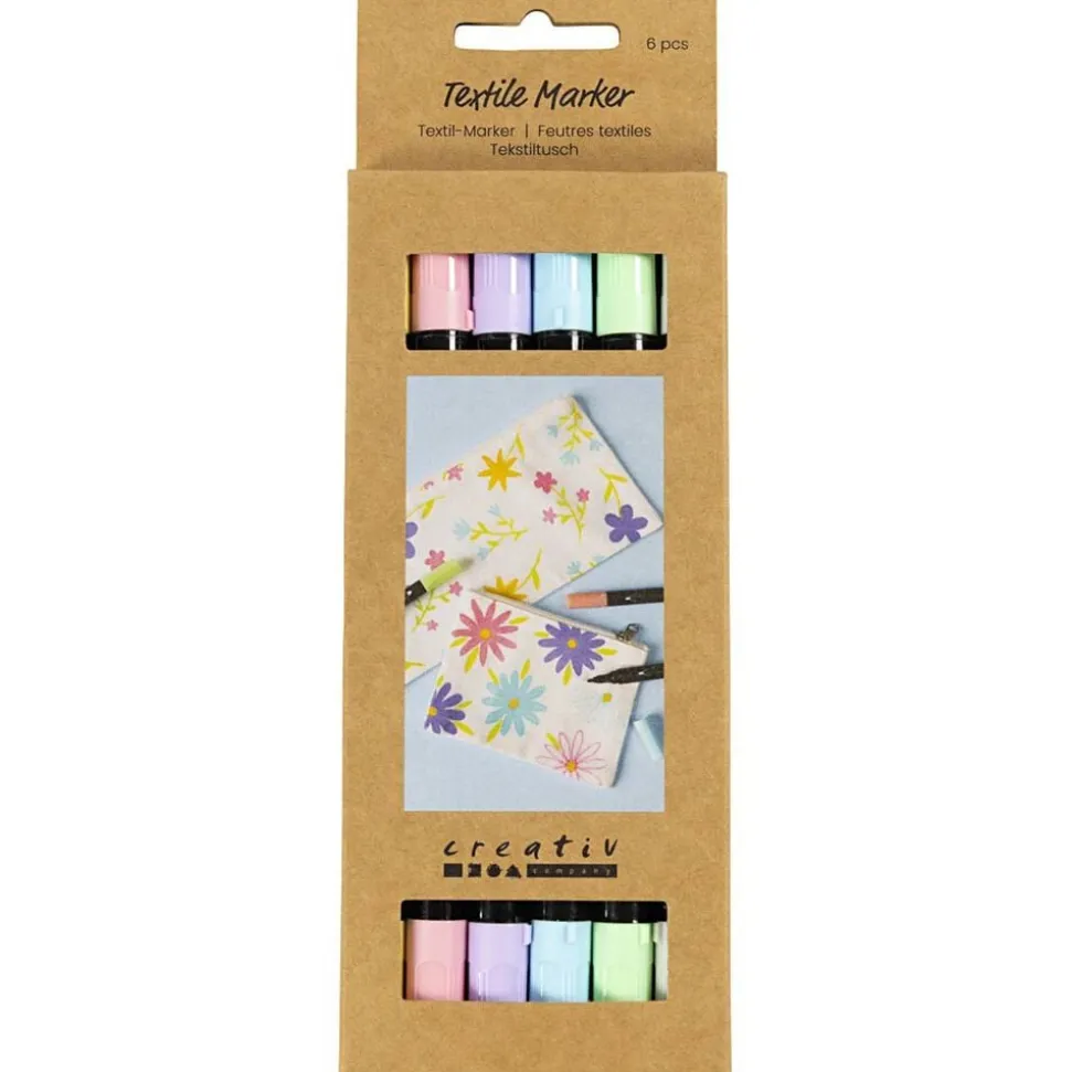 Semidækkende tekstiltuscher med to forskellige filtspidser i hver, som du kan bruge til at dekorere nye og gamle tekstiler med. Tekstiltuscher er gode til kreative genistreger. Med dem kan du bringe alverdens stof til live med unikke mønstre og søde tegninger – og du kan samtidig gå farve-amok! Tusserne er derfor et sikkert hit i alle aldre, både hos tegnglade voksne og kreative børn. Har du brug for en tynd streg til at tegne og skrive med – eller en tyk streg til at farvelægge med? Med vores tekstil markers får du begge muligheder. Så skal det være nemt at dekorere på tekstil og stof, er denne populære tusch et rigtig godt valg.. Ryst tuschen godt før brug, og læg plast eller pap ind i fx t-shirts og muleposer, så farven ikke smitter af på bagsiden. Når farven er tør, kan du strygefiksere med bagepapir over og under tekstilemnet. Efter strygefiksering holder farverne sig flotte i vask op til 40 grader C. Bemærk, at tuschen er perfekt til lyse tekstiler af bomuld m.m.