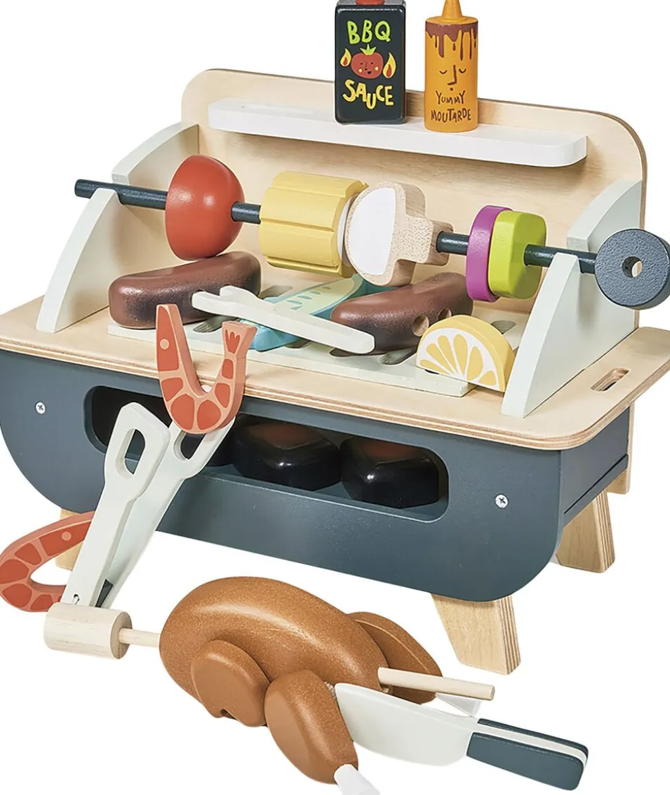 Legetøjsgrill i træ med aftagelig rist og masser af sjovt tilbehør som kan opbevares i grillen.