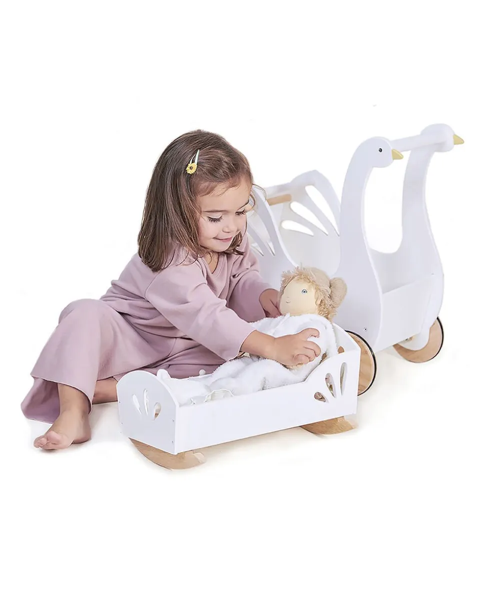 Sød lille vugge til dukker, malet i hvid med udskæringer og meder i træ.
