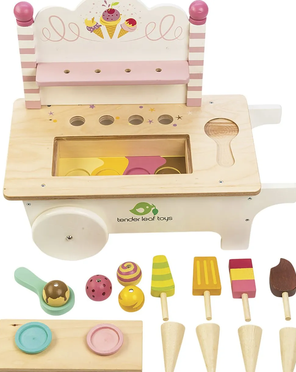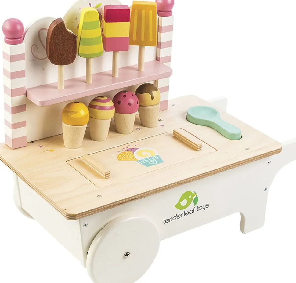 Smuk isvogn med hjul og forskellige slags is.
