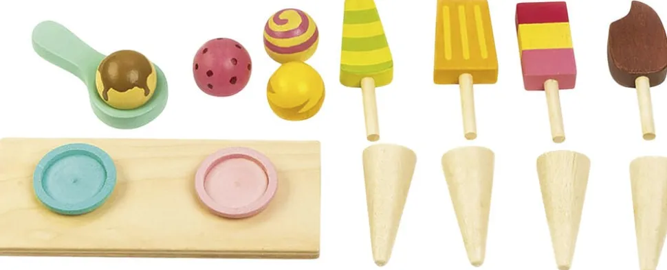 4 ispinde af træ, 4 kræmmerhuse, 4 farverige iskugler med magneter, en magnetisk isske og et aftageligt låg, hvorunder man kan opbevare alle isene.